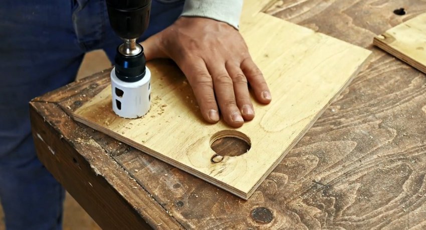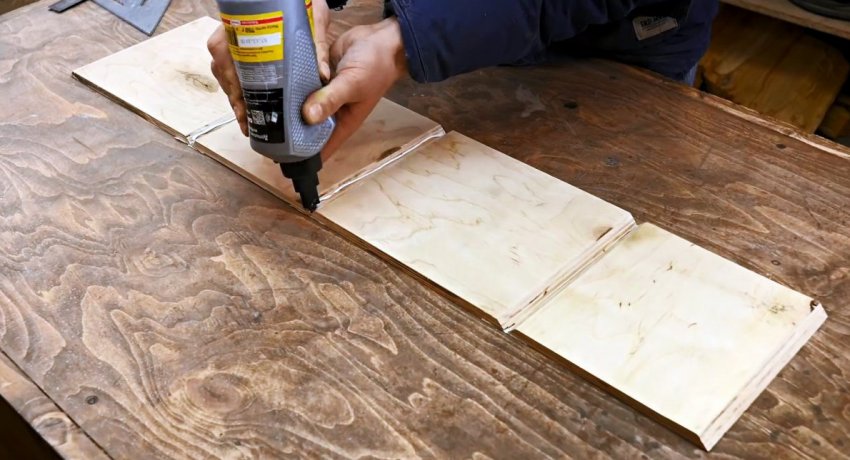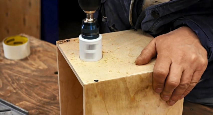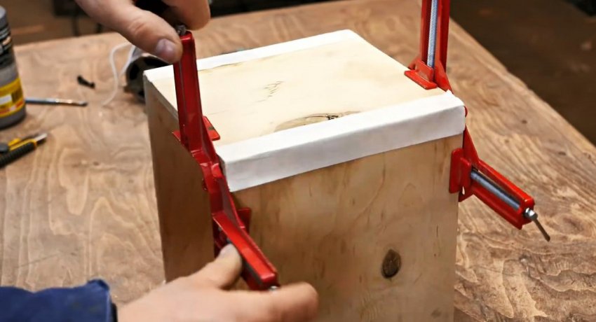 Их размер подбирается в зависимости от габаритов двигателя. На каждой заготовке подрезаются 2 противоположные фаски под 45°. Затем детали соединяются малярным скотчем в линию, фаски смазываются клеем, и заготовки склеиваются в короб. По углам он дополнительно фиксируется саморезами.