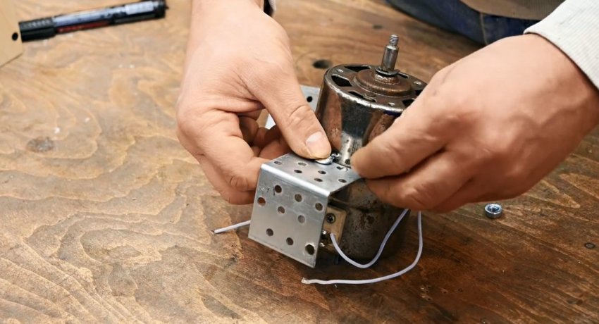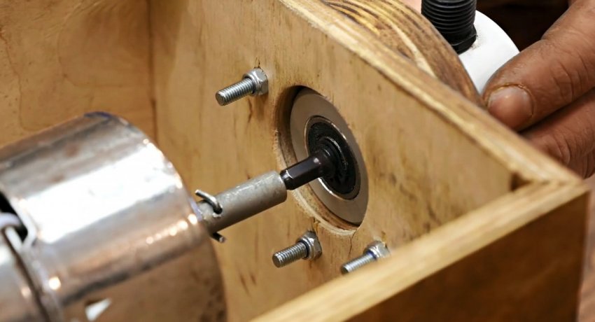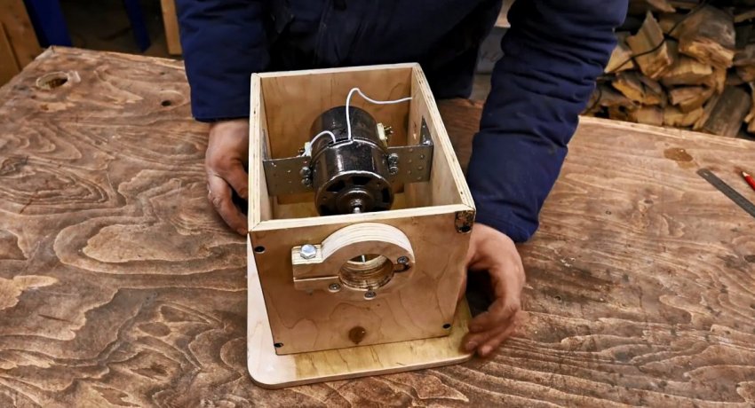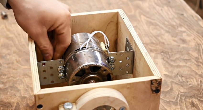 К корпусу двигателя прикручивается 2 уголка. С ними тот должен плотно входить внутрь короба. Мотор прикручивается так, чтобы вал выходил на центр отверстия с хомутом.
