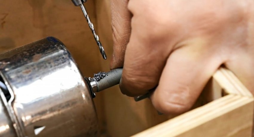 На вал двигателя набивается втулка из трубки. Ее нужно зафиксировать. Для этого просверливается отверстие в валу и втулке, затем забивается штифт.