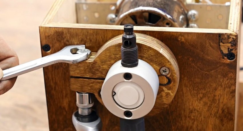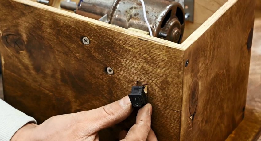 Из фанеры вырезается дно для короба. Оно прикручивается, и станина окрашивается. Сбоку врезается кнопка включения. Через нее к двигателю прокладывается кабель питания с вилкой.