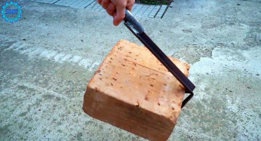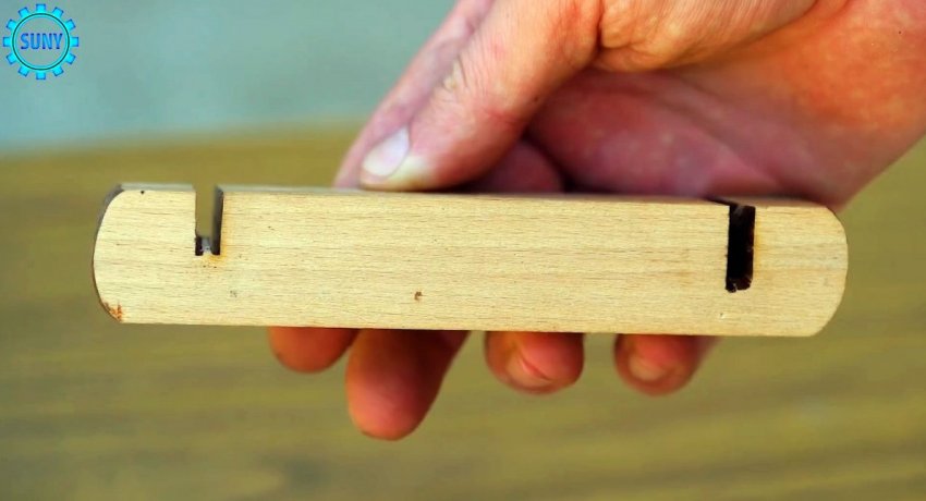 Для этой самоделки потребуется рейка или брусок длиной 15-20 см. Его торцы необходимо скруглить, затем сделать широкие пропилы перед краями.