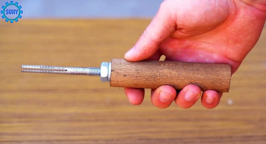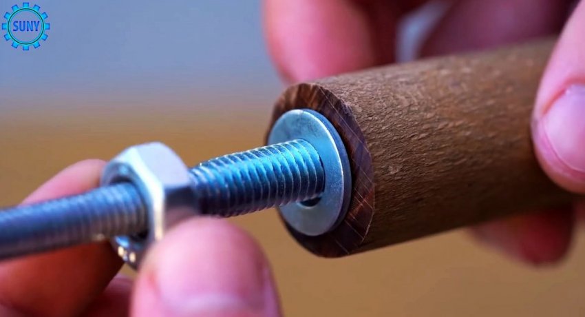 Далее берется отрезок деревянного черенка. В нем просверливается отверстие вдоль, и нарезается резьба под шпильку. Она вворачивается и поджимается гайкой.