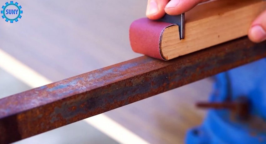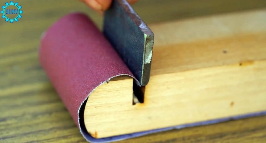 Под брусок вырезается наждачная бумага, загибается до разрезов и в них расклинивается вставками. В результате получается инструмент для шлифовки в плоскость.