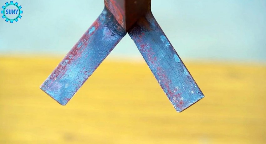 Затем каждая сторона раздвоенного края выгибается наружу под 90°.