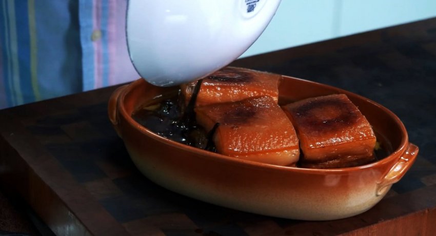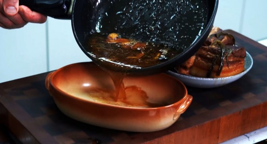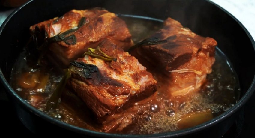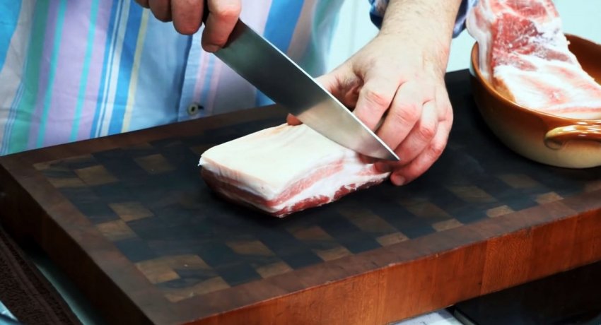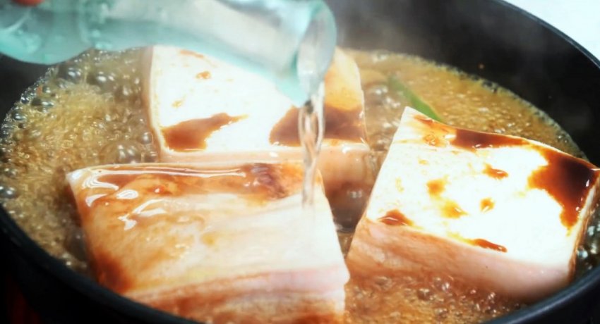 Сковородка накрывается крышкой, и выставляется нагрев так, чтобы блюдо слегка кипело. Через 1 час сало переворачивается кожей вниз и варится еще полчаса. Периодически нужно доливать воду, чтобы оно не подгорало.