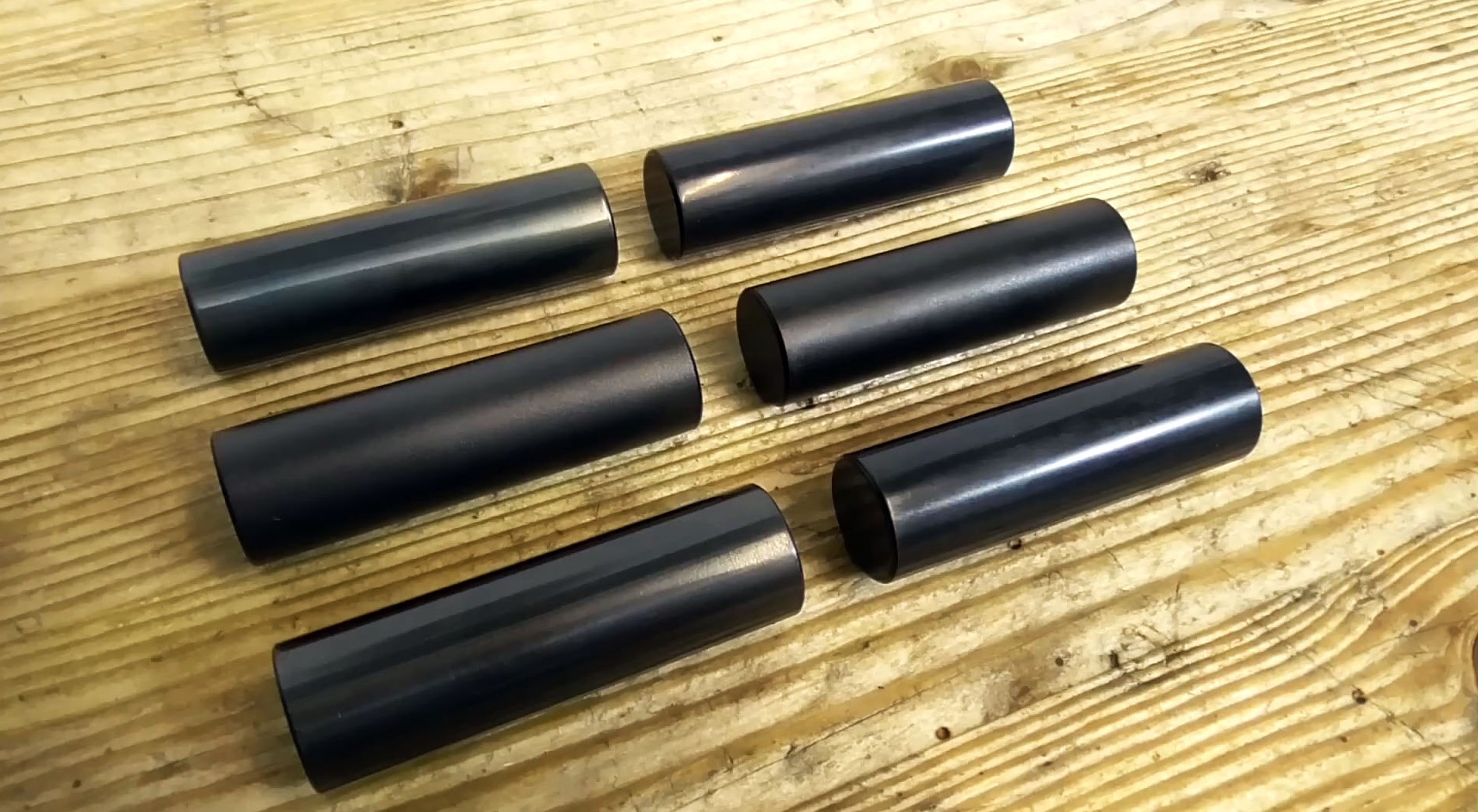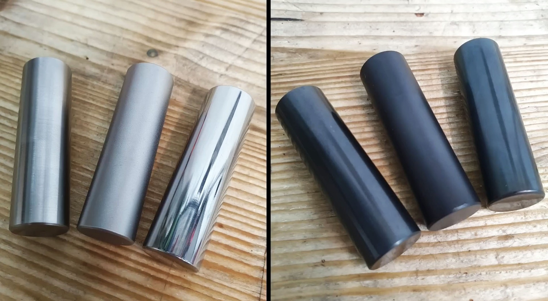 Давайте сравним детали, обработанные горячим и холодным воронением. Слева — горячее воронение, справа — холодное. Обе детали отшлифованы, обработаны пескоструем и отполированы. Детали с холодным воронением немного темнее, но в остальном результат почти одинаковый.