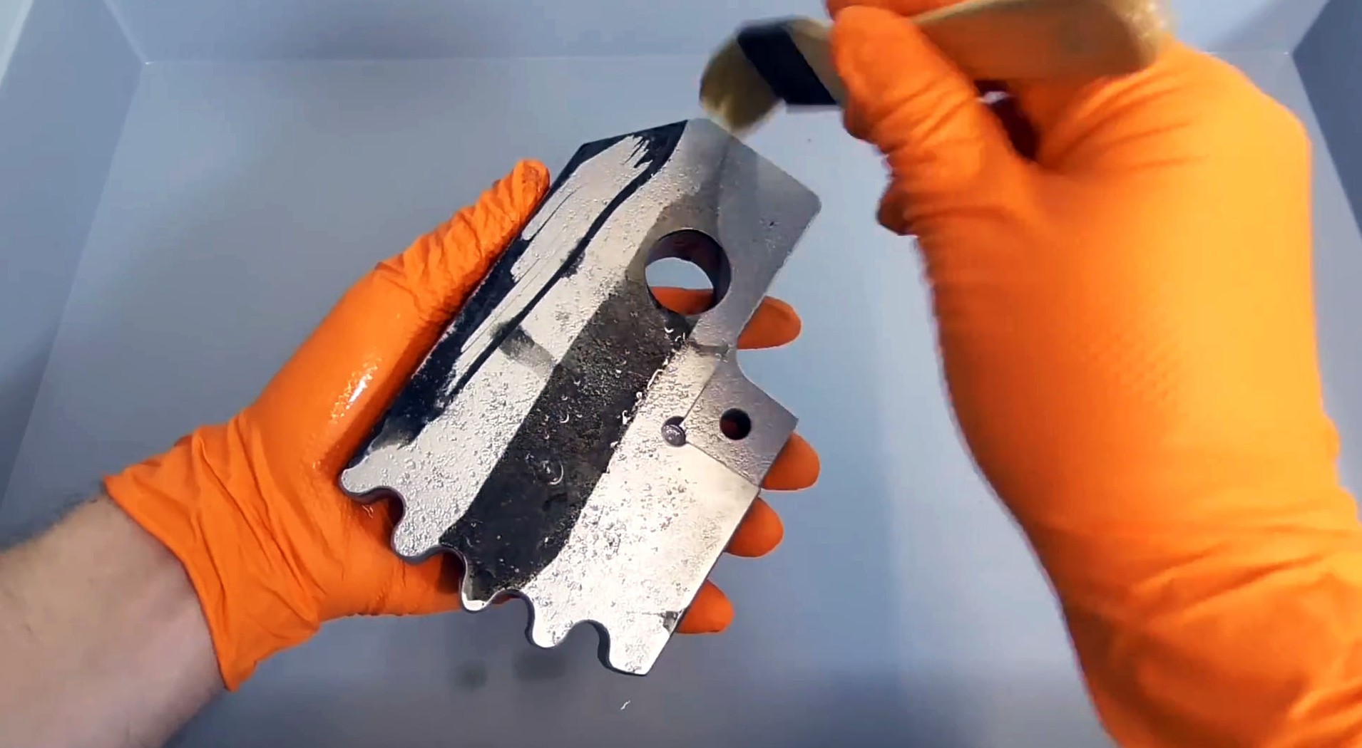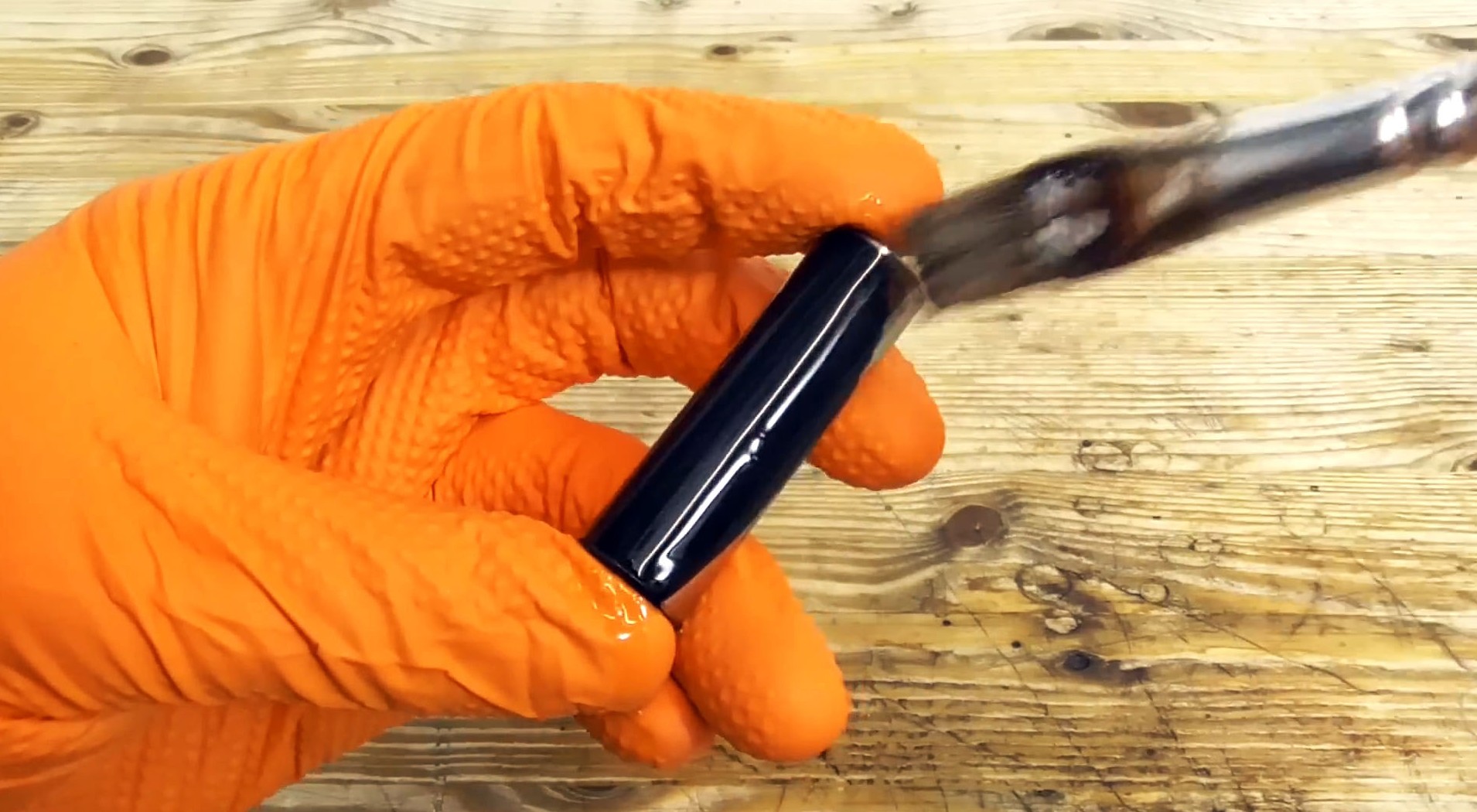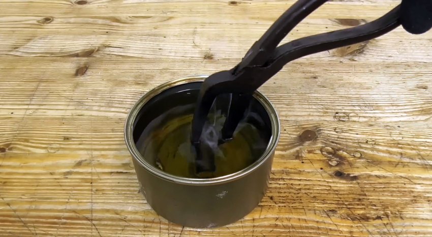 Из-за высокой температуры масло быстро впитается в поверхность, придав стали черный оттенок и защитив от ржавчины.
