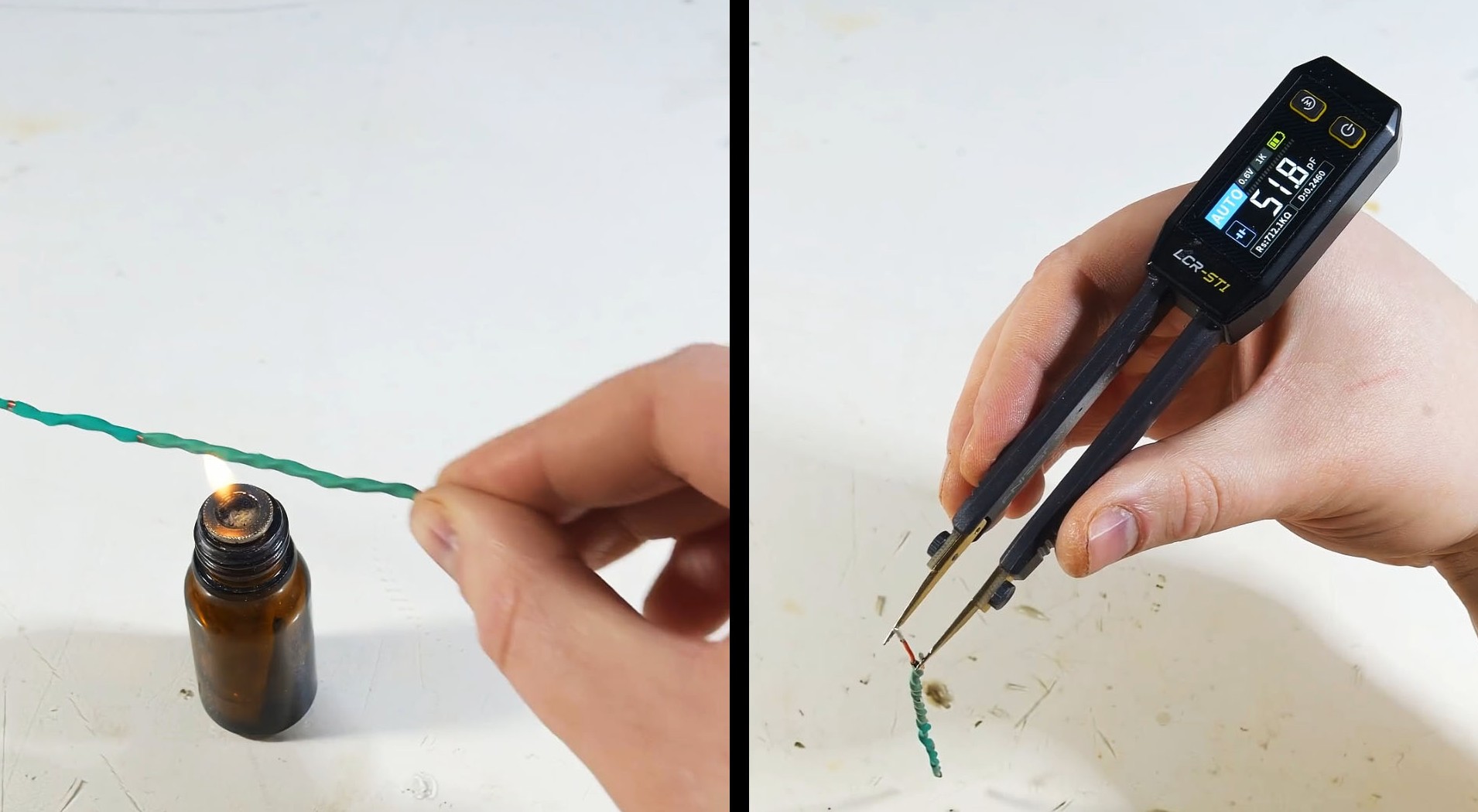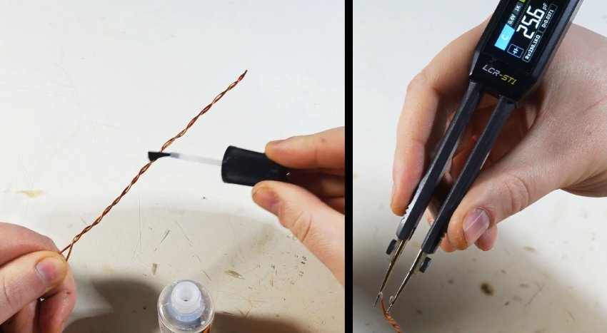 Я дополнительно покрыл его лаком в несколько слоёв, и ёмкость увеличилась до 25 пФ.