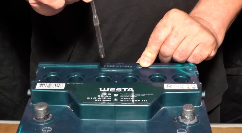 Для измерения уровня электролита нужна стеклянная трубка. В наших условиях можно использовать пипетку или трубку от системы капельницы, нагретую до размягчения. Уровень электролита должен быть от 10 до 15 мм. Если уровень недостаточен, лучше всего поднять его дистиллированной водой. Кислоту доливать не спешите.