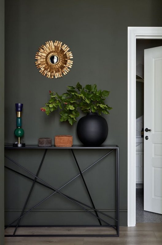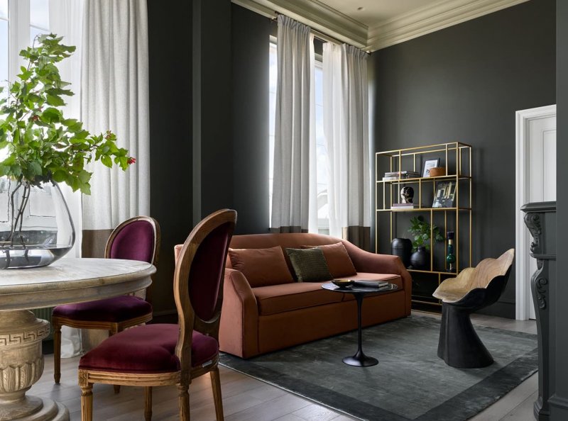 Это уже третий проект дизайнера Арианы Ахмад для одной семьи: ею были оформлены квартиры для дочки и матери. Теперь предстояло создать комфортное, интересное и практичное пространство для их любимой бабушки. Благодаря пяти большим окнам и высоким потолкам в квартире много дневного света и воздуха. Это позволило дизайнеру смело использовать в интерьере темный цвет. По просьбе заказчицы, планировка осталась стандартной без лишних экспериментов: кухня, столовая и гостиная объединены, а спальня расположена отдельно.