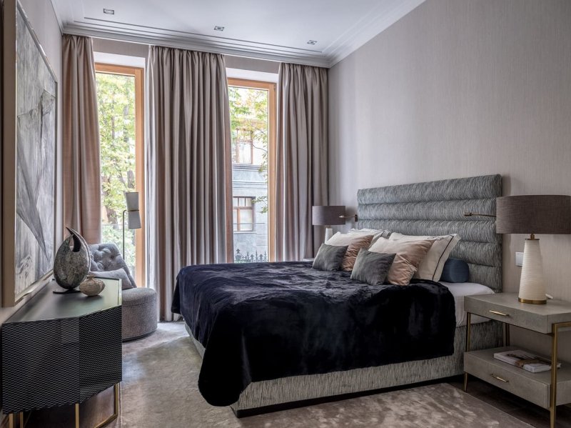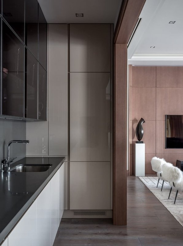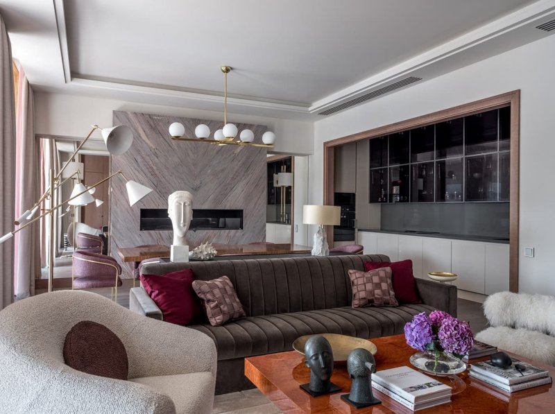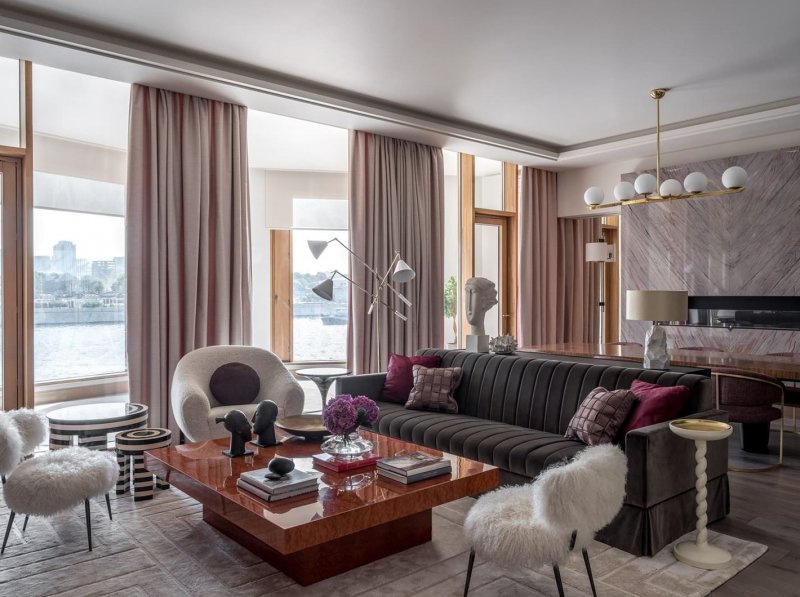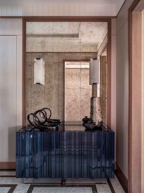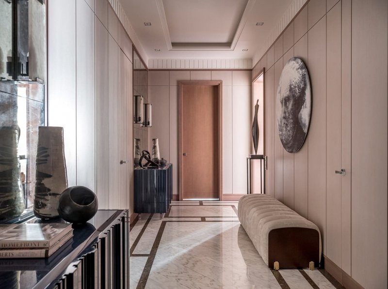 Владелица квартиры хорошо разбирается в современном искусстве и запланировала пространство под свою будущую коллекцию арт-объектов. Ее пожелания легли в основу концепции дизайнера Елены Чабровой и архитектора Марии Степаненковой. На планировку повлияло и расположение окон – практически все они, кроме двух спален выходят на Пречистенскую набережную. В конце коридора напротив друг друга расположены две двери-невидимки, ведущие в приватную зону и гостевой санузел.