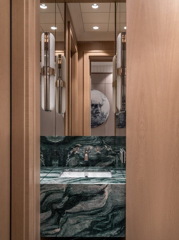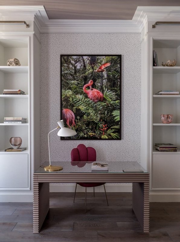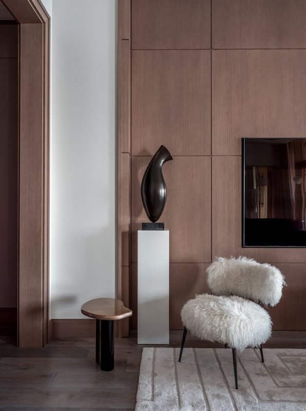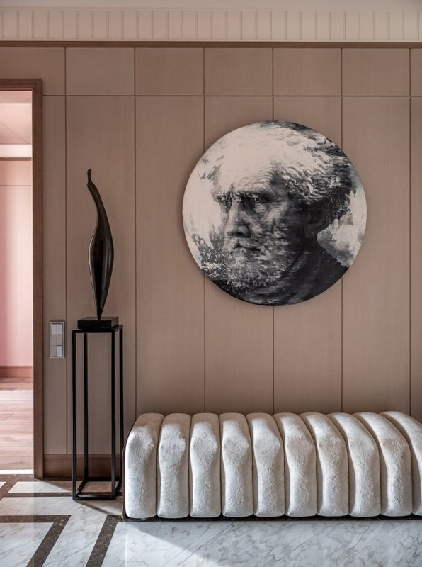 Палитра наполнена нежно-пудровыми пастельными оттенками. Большой кремовый ковер в гостиной, мягкие подушки и меховые обивки кресел добавляют уюта и теплоты. Многие предметы мебели и отделки сделаны на заказ: дубовые панели, покрывающие стены холла, кабинет и гостевой санузел, столы, диваны и комоды. Самым сложным, по словам авторов проекта, было выбирать искусство. Коллекция должна была не только украсить дом, но и стать грамотной инвестицией. Для большинства экспонатов характерны плавные, округлые линии, подчеркивающие мягкость и спокойную тональность интерьера.