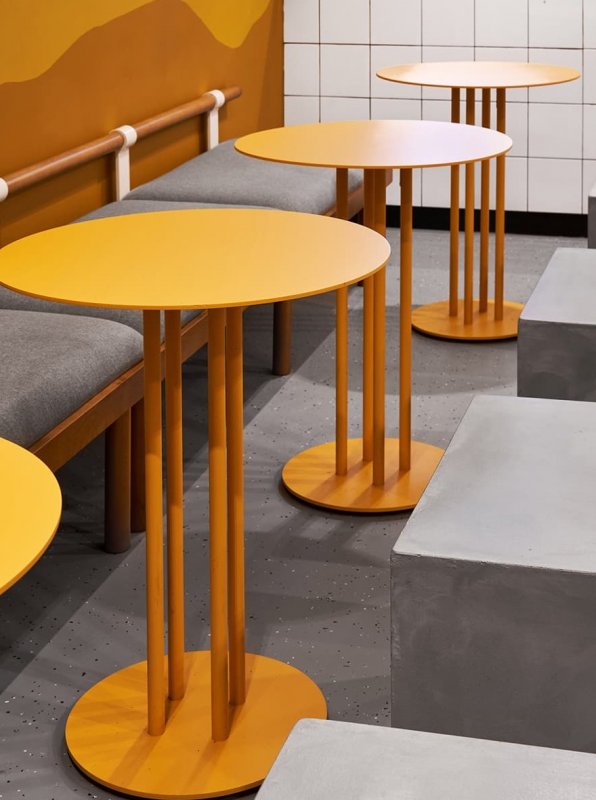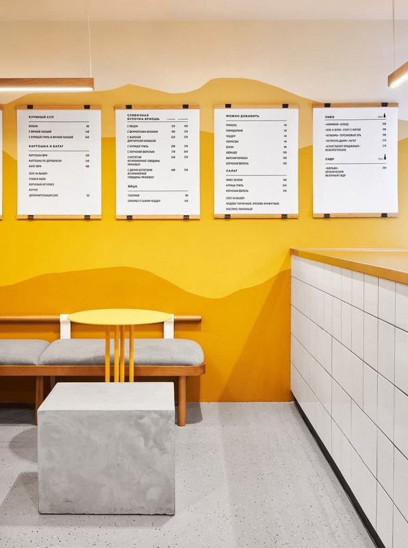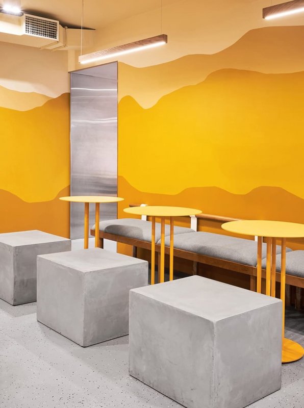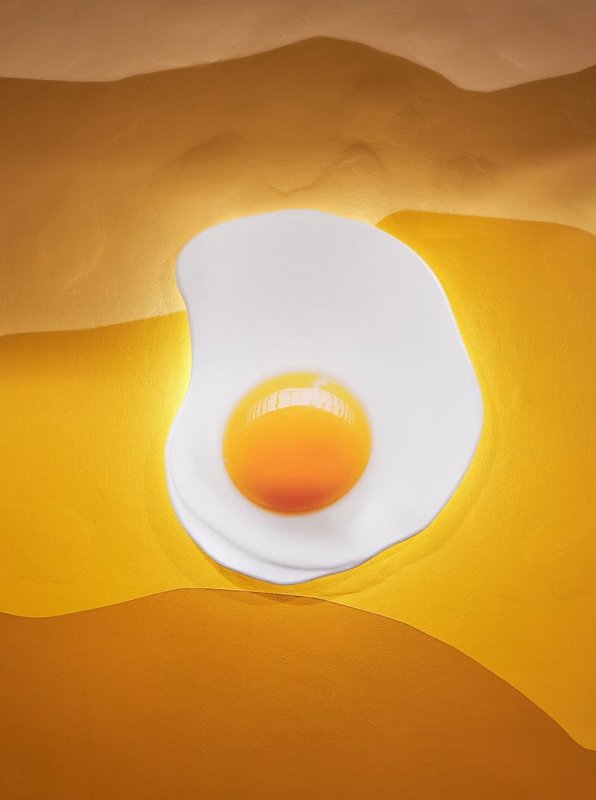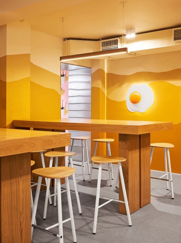 Длинное и узкое помещение с двумя залами и одним окном при входе вызвало сложности в планировке. Для поддержания интереса посетителей дизайнер решила сделать два зала абсолютно разными. В первом преобладают желтые оттенки с абстрактными очертаниями гор на стенах. Во втором зале на фоне лаконичной белой плитки вырисовывается розовая акцентная стена с виниловыми изображениями яичницы и женских ног. Неровность линий на стенах контрастирует с четкой геометрией круглых столиков, барных стоек и серых кубических табуретов. О фирменных рецептах кафе напоминают светильники в форме яичницы, изготовленные по эскизам Анастасии.