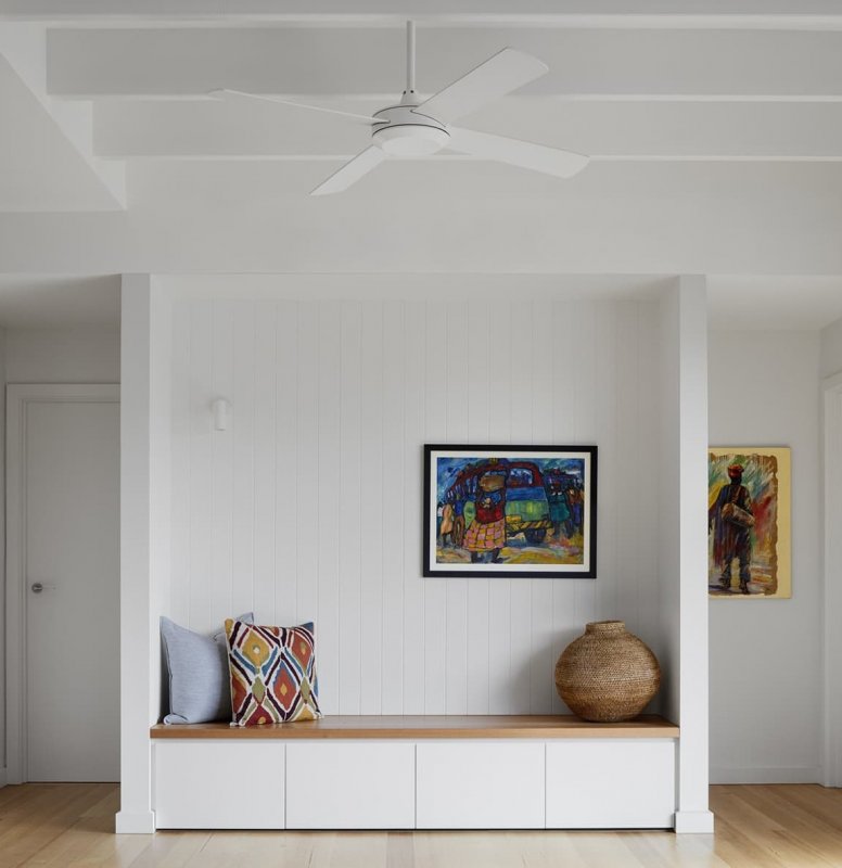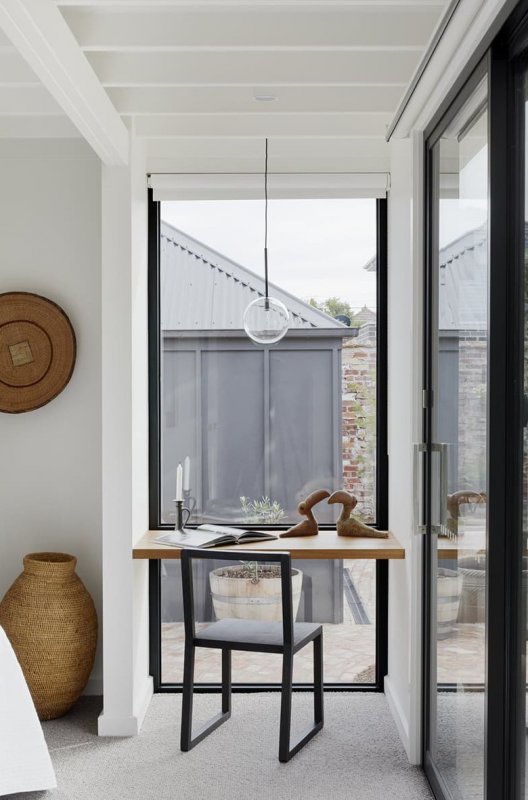 В отделке преобладают светлые лиственные породы викторианской эпохи. Теплые текстуры обеспечивают мягкий, приглушенный фон для ярких оттенков и натуральных поверхностей, присутствующих в аксессуарах и произведениях искусства из Африки – родины владельцев особняка. Низкие удлиненные консоли вдоль белоснежных стен в гостиной максимизируют ощущение высоты, а открытые стеллажи позволяют выставить большую коллекцию африканских артефактов. Двери в главную спальню и прачечную практически скрыты от глаз. Небольшой уголок в спальне обеспечивает тихое место для работы с видом на сад. Внутренние потолочные балки продолжаются снаружи, образуя массивную перголу и визуально расширяя жилое пространство.