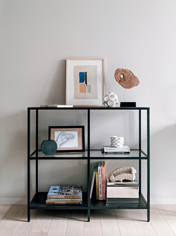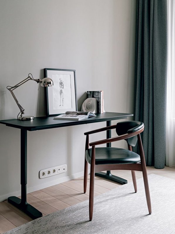 Владельцы квартиры – супружеская пара, которая часто находится в разъездах, активно занимается спортом и не любит засиживаться дома. Поэтому дизайнер Ирина Ежова решила создать лаконичный интерьер в духе номера современного отеля без лишних предметов быта и аксессуаров. Основное пространство в небольшой комнате занимает кровать и узкая консоль-рабочий стол со стулом. В качестве дополнительного места для сидения можно использовать подоконник с широкими деревянными откосами.