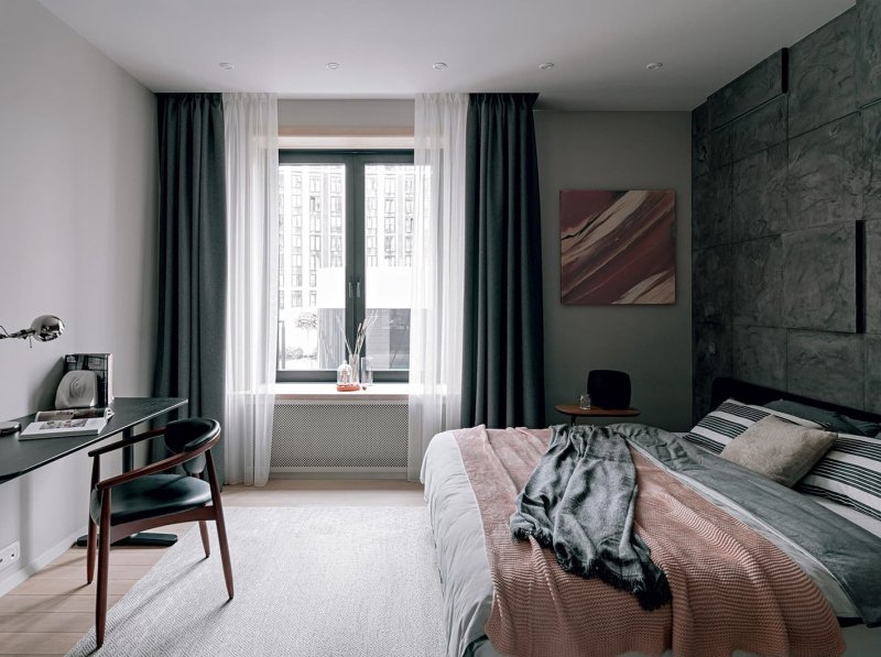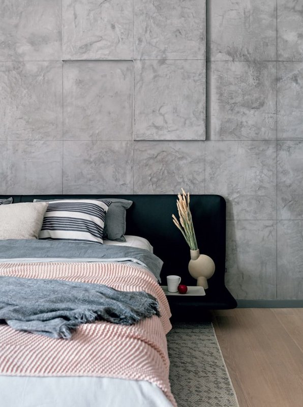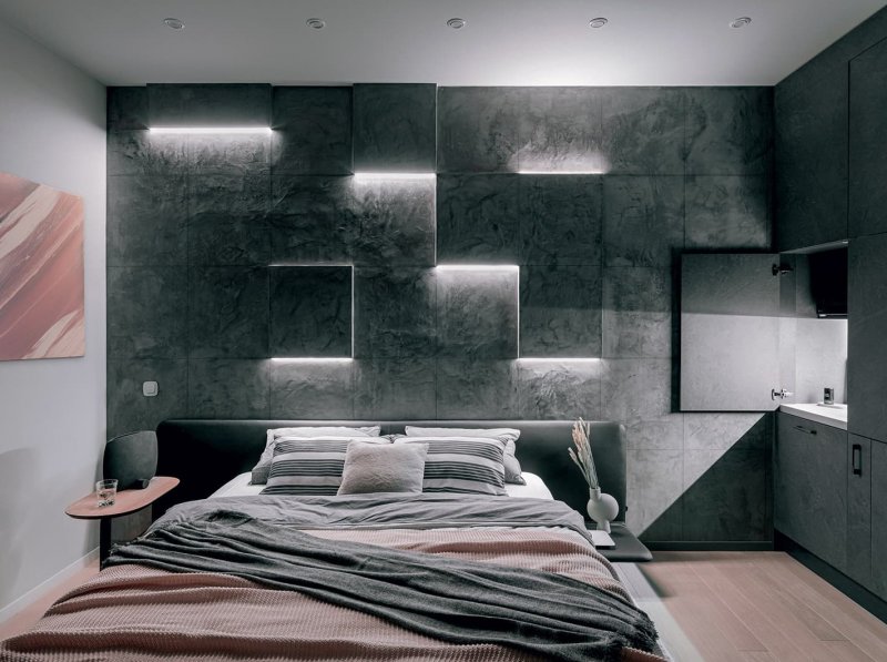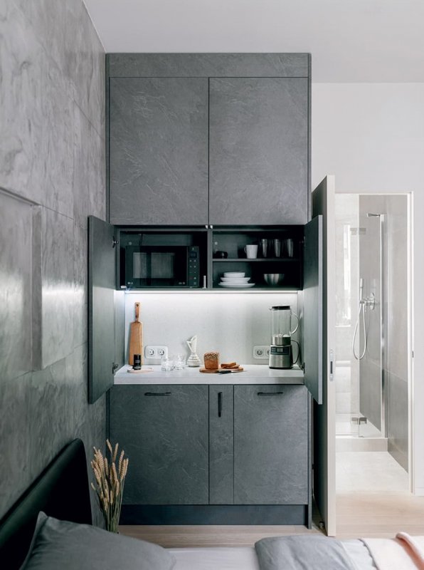 В палитре много спокойных светло-серых и пыльно-розовых оттенков. На их фоне эффектно и брутально выглядит фактурное изголовье кровати из квадратов гипсокартона, покрытых микробетоном. Между выступающими краями элементов проведена скрытая подсветка. Поскольку владельцы квартиры сами не готовят, то полноценной кухни в планировке не предусмотрено. Все, что необходимо для приготовления легкого перекуса, спрятано в шкаф рядом с кроватью. Его фасады имитируют фактуру изголовья. Остальные вещи можно хранить в большом вместительном шкафу, встроенном в стену прихожей.