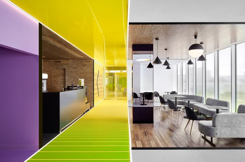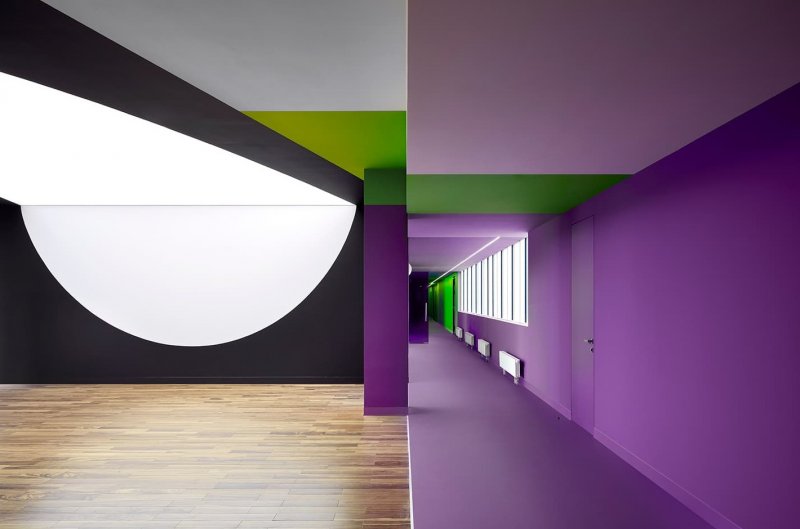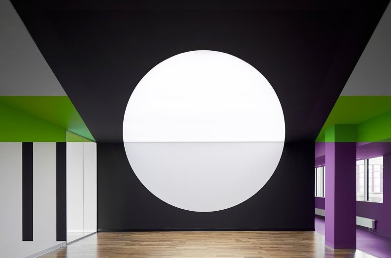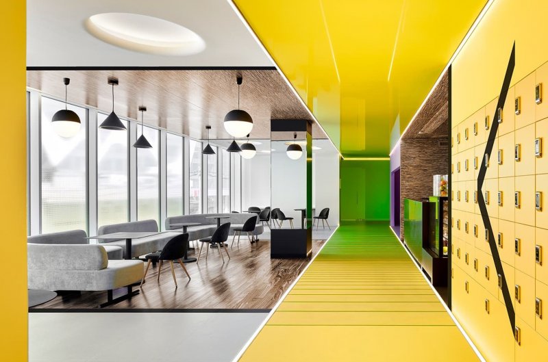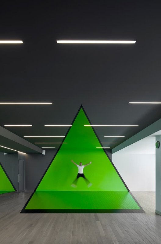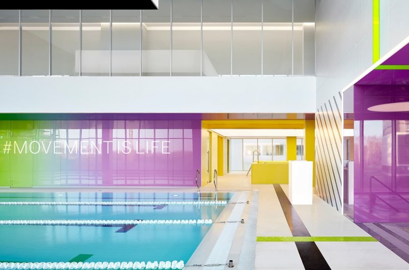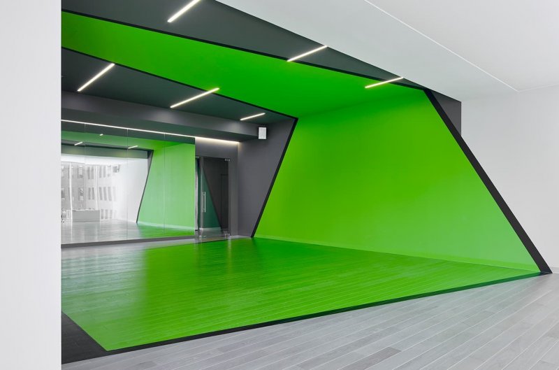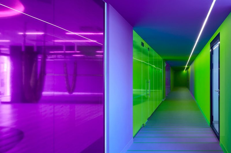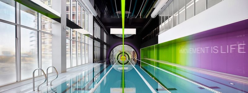 Воплощению дизайнерской идеи способствуют насыщенная цветовая палитра и продуманная концепция освещения. Цвет является основой пространственной навигации, частью декора и даже элементом пластических решений. Фирменные оттенки зеленого и темно-серого антрацита дополнены теплым желтым и холодным фиолетовым. Двигаясь из одного зала в другой, посетитель клуба словно растворяется в интерьере и, отражаясь в многочисленных зеркалах, переходит в новое качество. Освещенный огромным окном черно-белый бассейн трансформирует пловца, переплывающего из тени в свет.