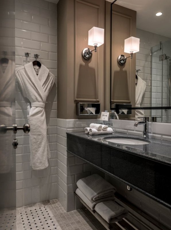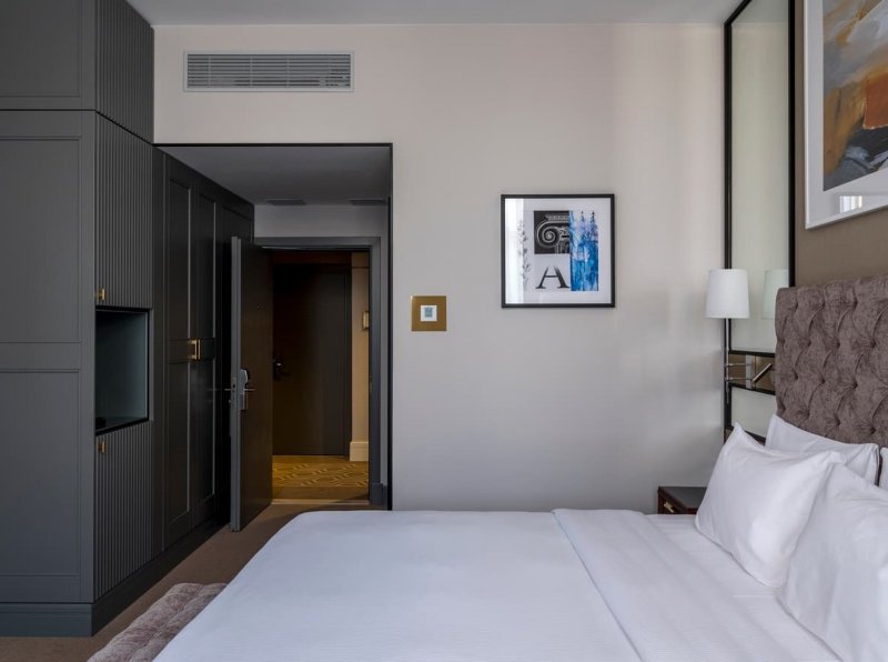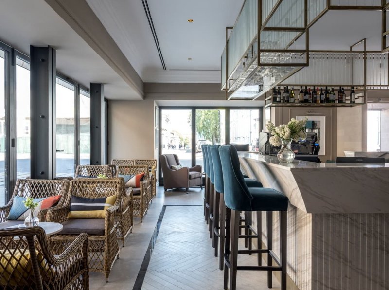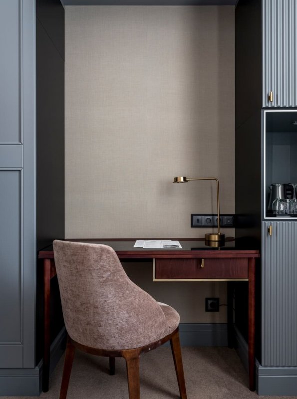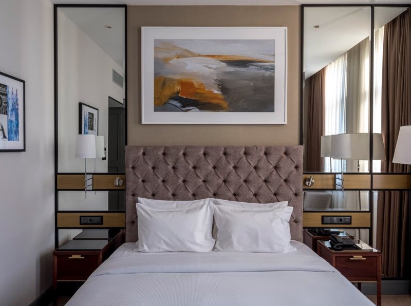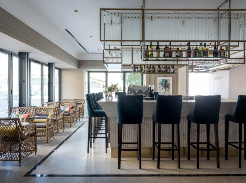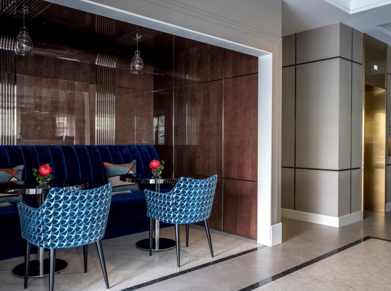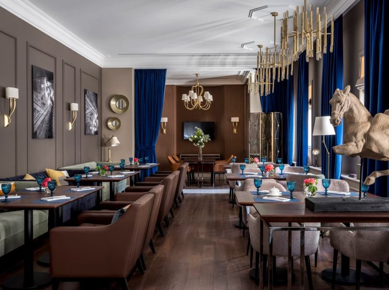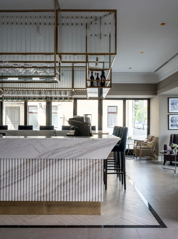 В отличие от театра, который, как известно, начинается с вешалки, гостей встречает «кафе» – барная стойка округлой формы. Она отлично просматривается через панорамные окна, что делает ее главной точкой притяжения отеля. В общей палитре преобладают пастельные тона. Яркие арт-объекты из бронзы и литого стекла, изящные кожаные кресла, плотный текстиль в обивке мебели, необычные световые решения помогают расставить акценты. В их числе – лампа в виде стаи чаек в лобби отеля. Окна в пол служат связующим звеном между внутренним пространством и городским ландшафтом, одновременно являясь метафорой главных черт русского характера – открытости и гостеприимства.
