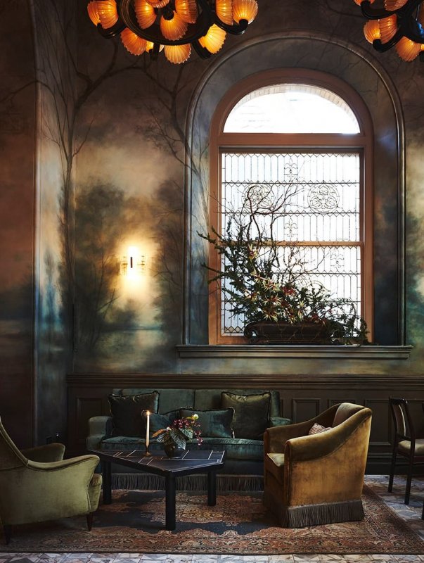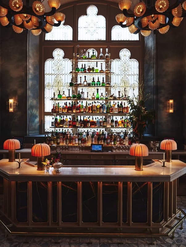 Стены бара расписаны таинственным лесным пейзажем местного художника Дина Баргера. Палитра из землистых и голубых тонов отсылает к ранним работам Пита Мондриана. Бледные дубовые полы, темная обивка из мохера, полированные мраморные столешницы из розового перлино и нестандартные светильники в форме яйца создают многослойный эклектичный рисунок. Восстановленный витраж служит фоном для семи ярусов аптечных бутылочных полок и бара из черного мрамора Сен-Лорана. Романтичные композиции из цветов контрастирует с брутальными дверными проемами из черной латуни, вдохновленными сюрреализмом Джорджо де Кирико.