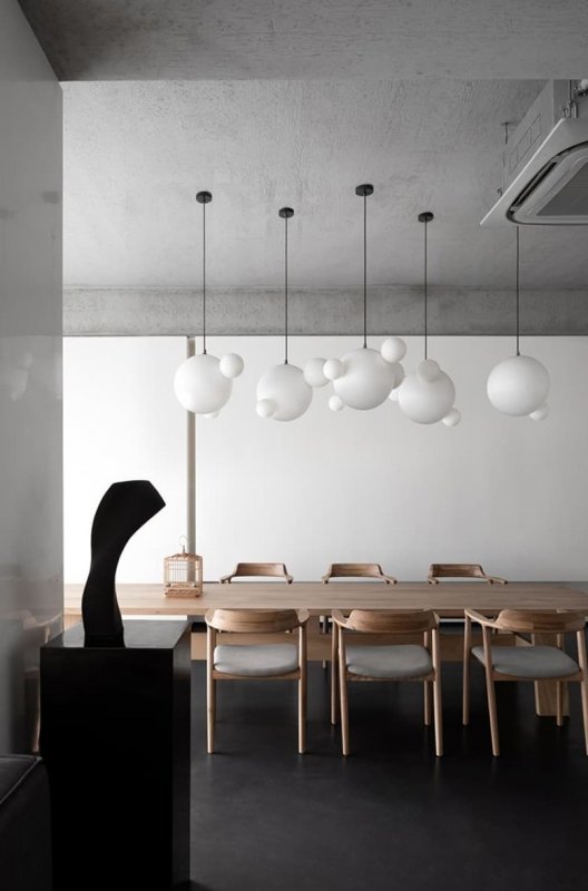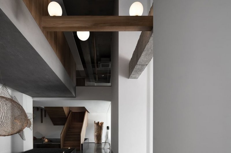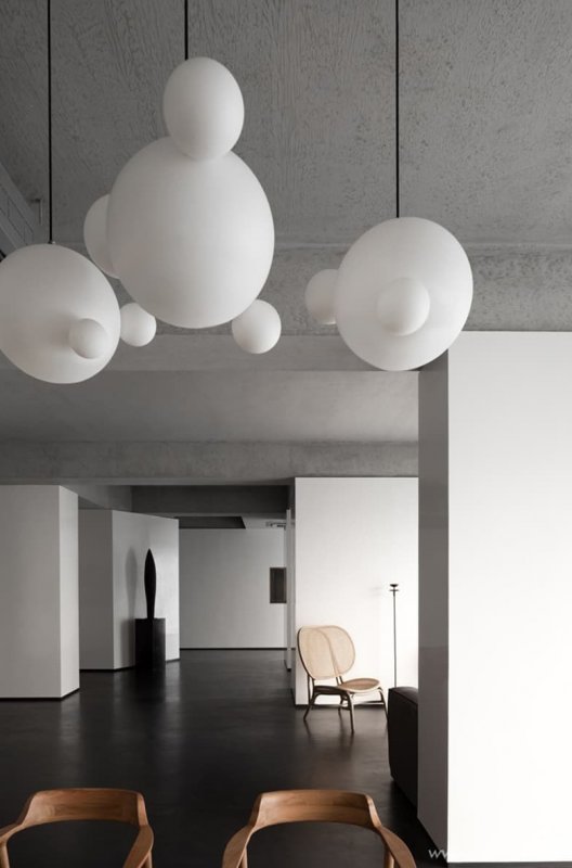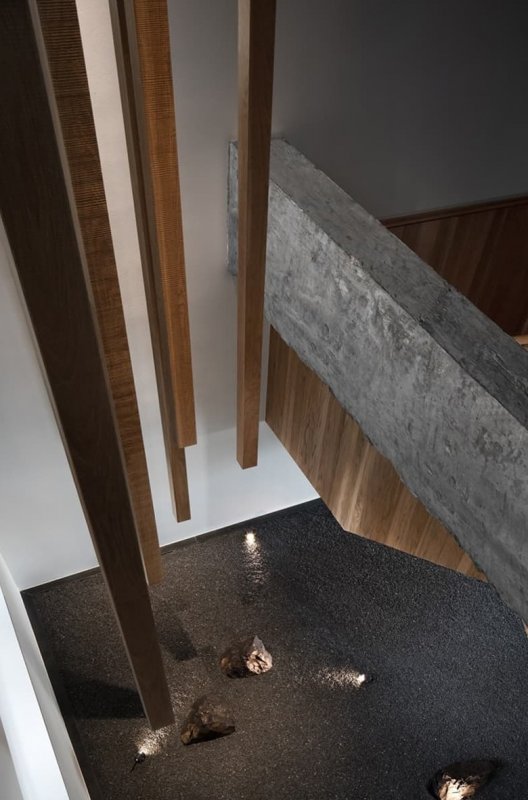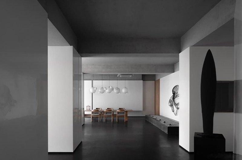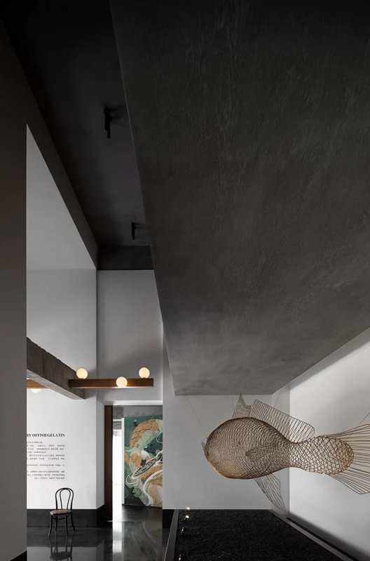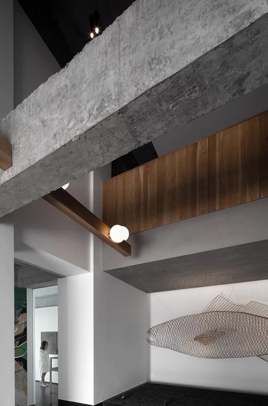 Через массивную бетонную балку на потолке пропущены более тонкие деревянные балки с россыпью круглых «пузырей»-плафонов. Такое решение улучшает эстетику и функциональность потолочной конструкции. В экспозиционный зал ведет большая стеклянная дверь. Возле нее на стене висит абстрактная картина, посвященная взаимосвязи рыбы и человека. Брутальная палитра обстановки и продуманный световой сценарий помогают подчеркнуть форму и текстуру каждого экспоната.
