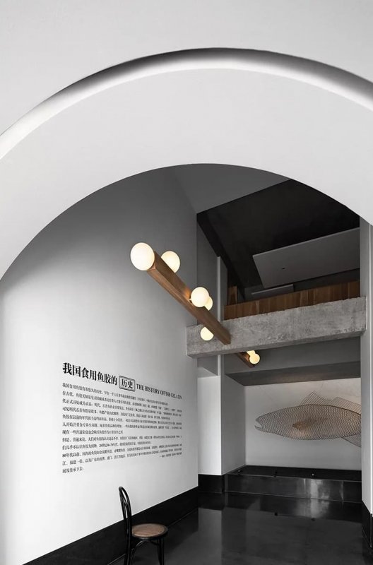 В китайском городе Шутоу открылся музей, целиком посвященный рыбьему пузырю. Перед его оформителями стояла задача – создать современное комфортное пространство, учитывающее нюансы экспонирования крохотных и деликатных объектов. Сразу при входе гостей встречает инсталляция с парящей рыбой, сделанная вручную из металлической проволоки. Ее легкие воздушные формы перекликаются с главной тематикой музея. Первый и второй этажи соединены минималистичной лестницей из дуба. Из него же изготовлена вся мебель в лобби. Состаренная текстура и цвет древесины напоминают шершавую поверхность рыбных пузырей, что создает диалог между материалами и коллекцией.