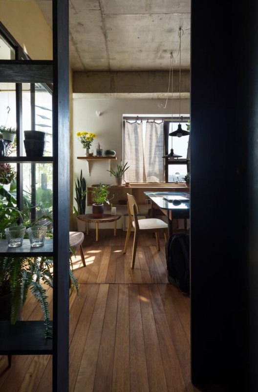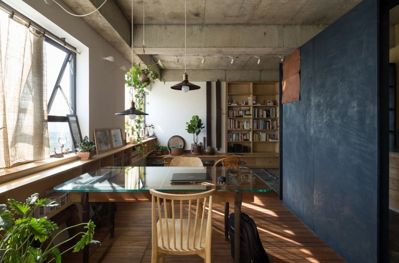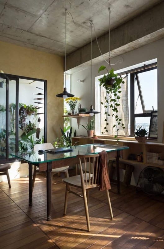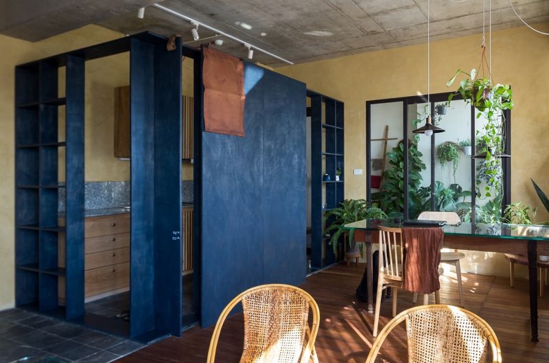 Отделочные материалы и предметы декора отличаются простотой и натуральностью. Легковесная мебель из дерева и стекла не загромождает пространство. Столы выполнены на заказ из деталей старого гарнитура. Их стеклянные поверхности демонстрируют структуру мебели, не отбрасывая лишних теней на полу. Ключевые цвета палитры – насыщенный индиго и песчано-желтый. Их контраст подчеркнут на фоне естественных оттенков дерева и зелени. Мини-сад на балконе соединяет жилое пространство и спальню.