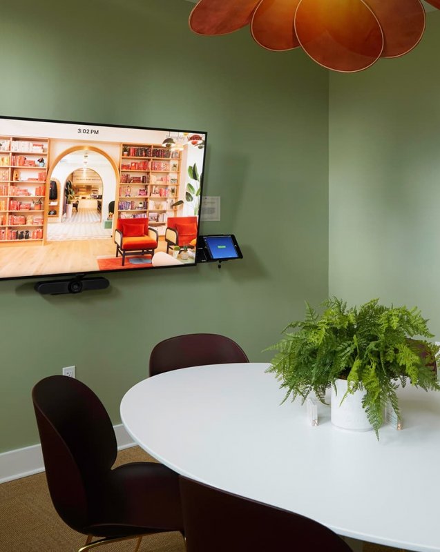 Просторная и очень светлая гостиная встречает посетителей уютными диванами вдоль высоких окон, мягкими стульями и черными столами-многоугольниками. Почти вся мебель изготовлена на заказ, включая темно-синие столики терраццо с абрикосовой мраморной крошкой. Для каждой из комнат предусмотрены разные светильники необычной формы и много «живого» декора. Два этажа коворкинга объединяют в себе конференц-залы, переговорные, кафе, библиотеку, салон красоты, душевые, игровые для детей и комнаты для кормления младенцев. Приятный бонус – просторный уютный дворик на крыше здания.