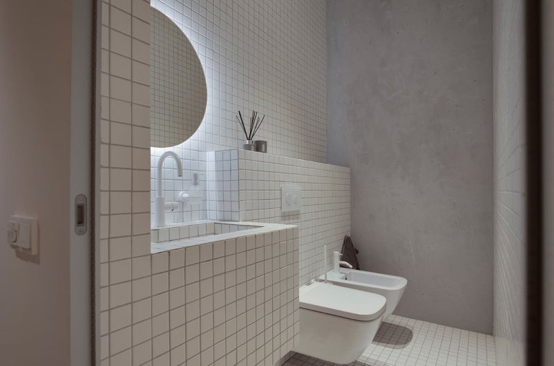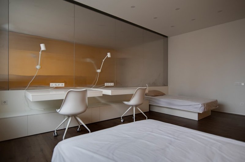Отправная точка проекта — пространственная концепция, основанная на простейшей геометрии. Квартира представляет собой множество прямоугольников, сливающихся в одно целое. Здесь нет лишних дверей, зато есть зеркала, которые создают игру отражений. В то время как квартира выступает единым пространством для всей семьи, каждая комната имеет свои акценты. Например, отличительная черта кухни/столовой — монохромная палитра и бетонная стена, на которой «разбросаны» предметы мебели в виде геометрических фигур. В спальной комнате взгляд падает на созвучие пола и деревянного кубика Lego, в котором прячется шкаф, а в гостиной — на идеально белую фактуру и отсутствие выраженных деталей.