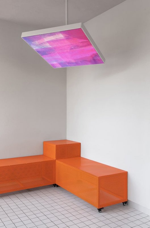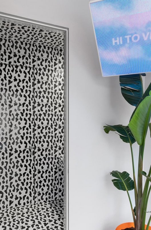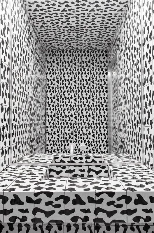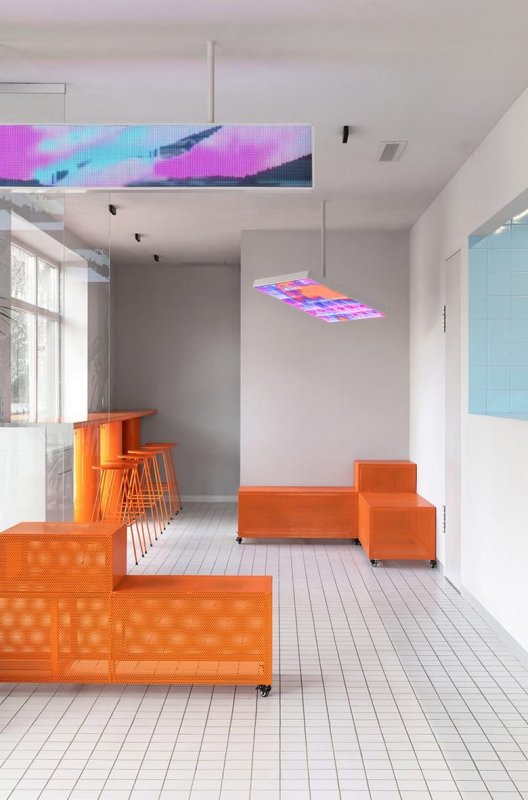 Среди других необычных приёмов, использованных архитектором в проекте, — подвешенные под потолком экраны, на которых транслируются видео в неоновых цветах (не иначе как для медитации new age), и ванная комната, полностью облицованная плиткой под пятно шкуры коровы. Возможно, менее выделяющаяся, но все же существенная деталь — пол кафе: белые советские «квадратики» удивительно хорошо сочетаются с лаконичными формами мебели. Минимализм интерьера теряет свою ориентацию во времени и становится для гостей заведения конструктором — материальным и умозрительным.