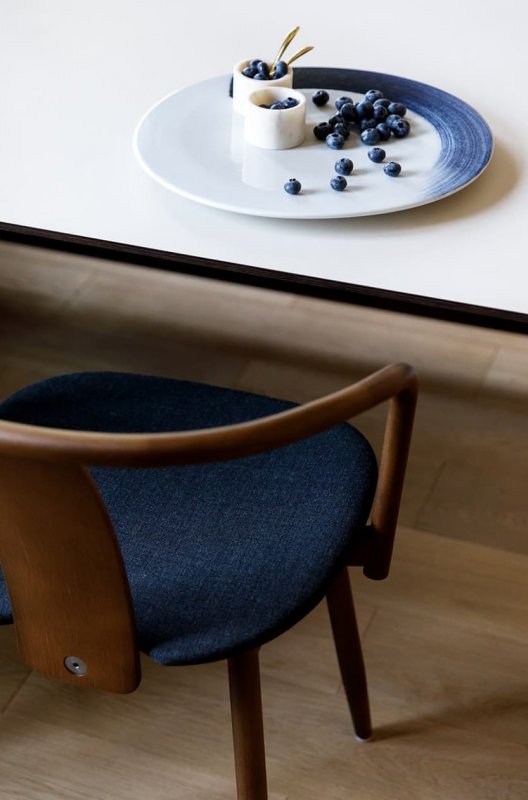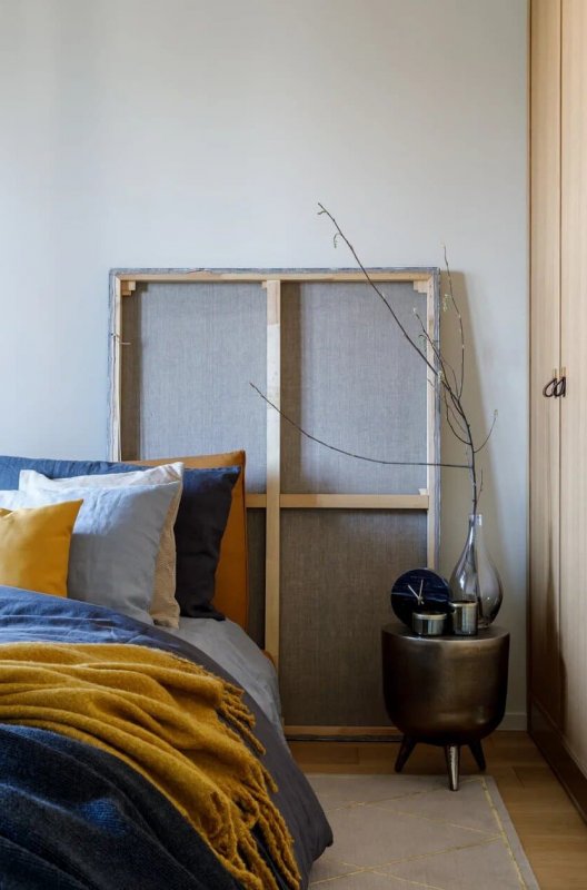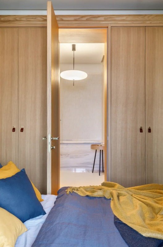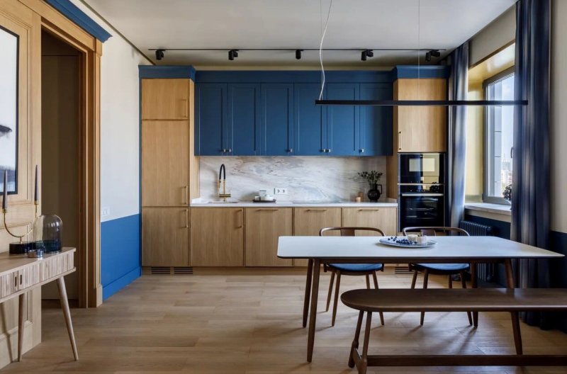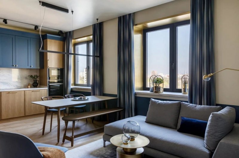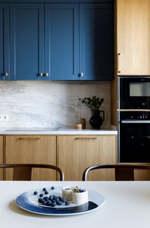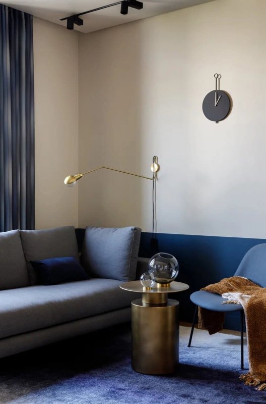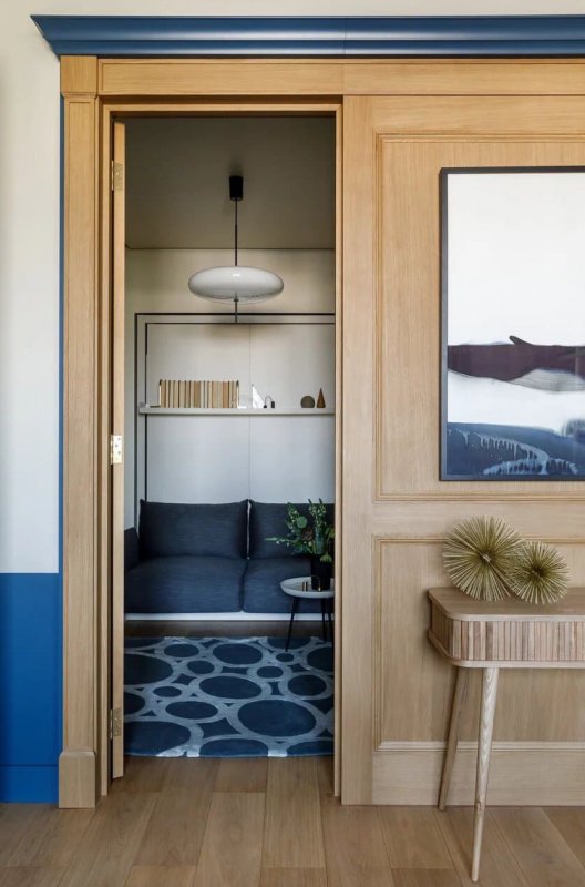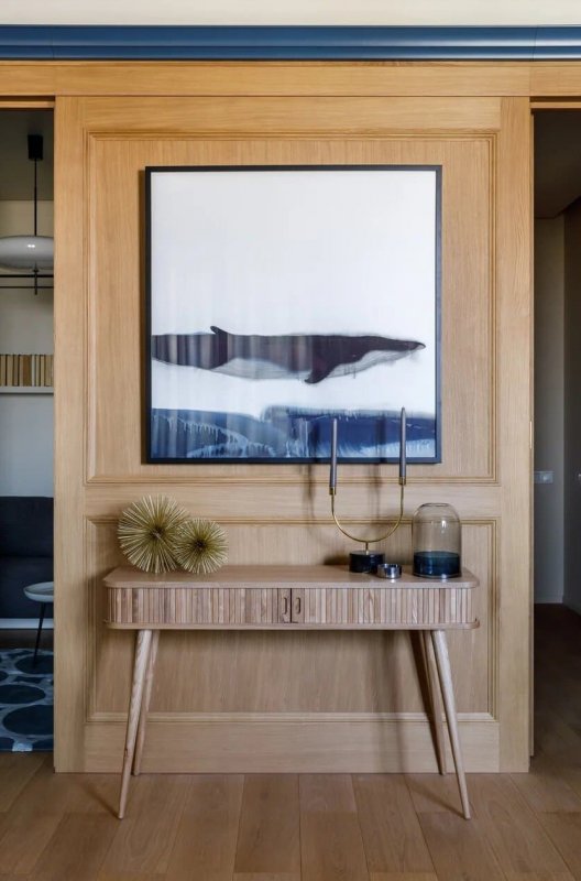 В основе цветовой палитры интерьера лежат натуральные оттенки шпона и синего — от сочного черничного до сизого голубого. Выбранные цвета создают атмосферу умиротворенного погружения в пространство квартиры, которое напоминает бескрайний океан. Дизайнер визуально расширила площадь за счёт необычного соединения спальной и ванной: проход из одной комнаты в другую осуществляется … через дверь шкафа. Дополнительное место для размещения гостей на ночь — компактный диван в гардеробной, который легко раскладывается в горизонтальное положение. Золотистая фурнитура и минималистичные аксессуары прибавляют интерьеру элегантности и роскоши. Картина «Кит» авторства Полины Егорушкиной передаёт характер пространства, а о хозяине квартиры возможно что-то скажет портрет легендарного лётчика-космонавта.