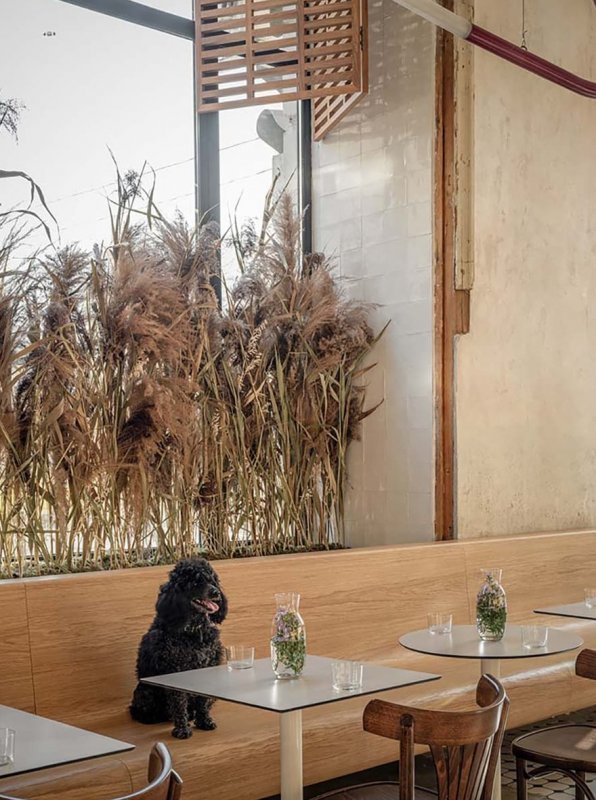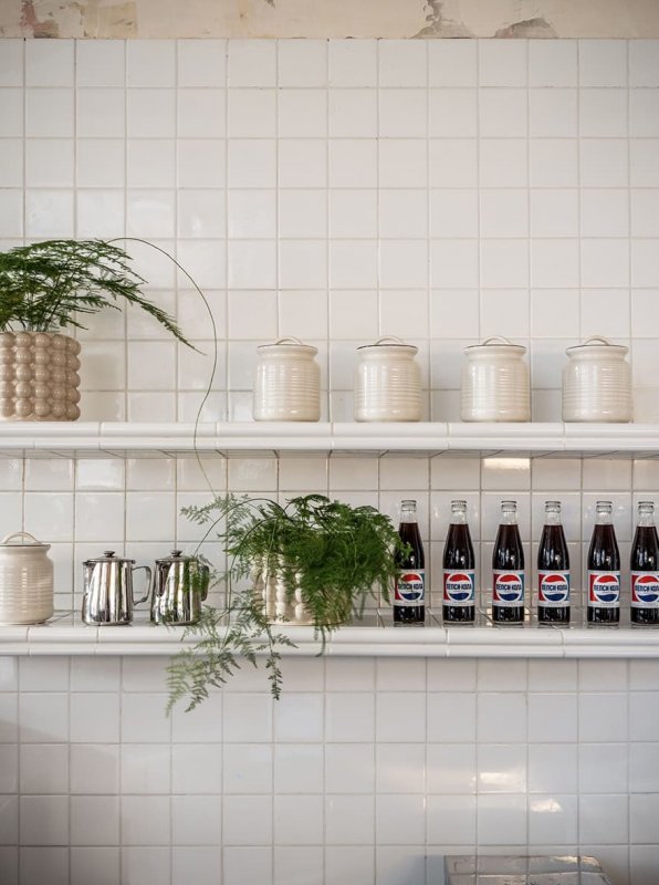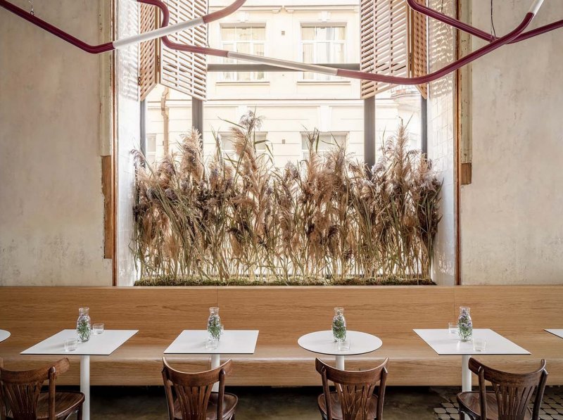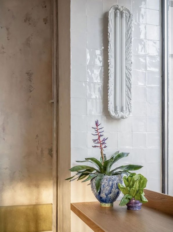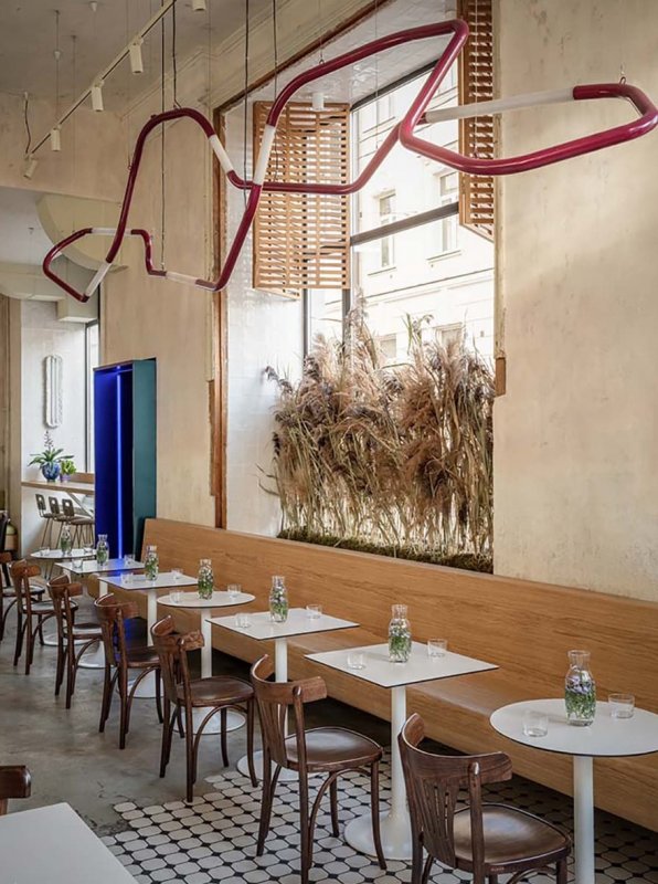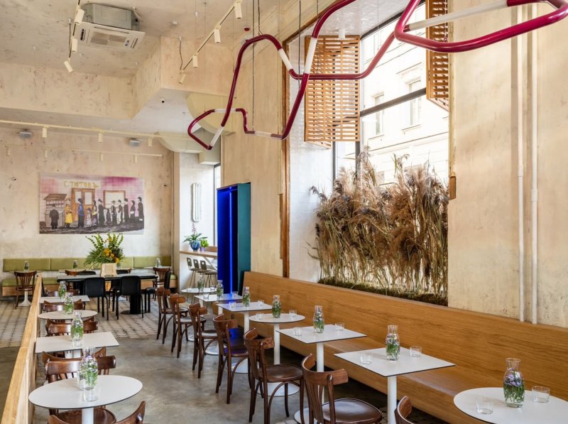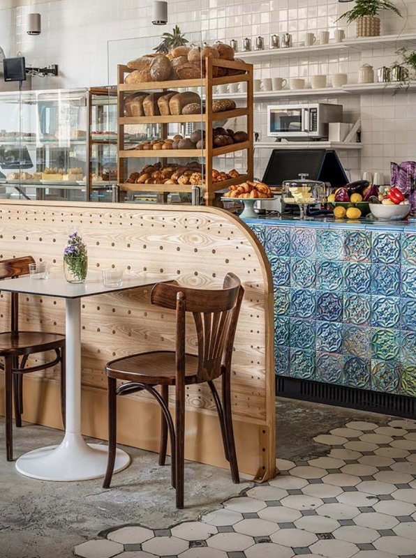 Самобытность пространства читается в крупных мазках и аккуратных деталях: в откосах стен авторы проекта сохранили оригинальную цементную и керамическую плитку, бережно отремонтировав то, что осталось со времен булочной. Не сильно изменился облик окон, ведь деревянные наличники были восстановлены по старому подобию. Из «свежего», отсылающего к быту дореволюционной Москвы, — венок из сухоцветов на центральном окне, напоминающий пшеничное поле, хлебный стеллаж с выпечкой, изразцовая плитка ручной работы.