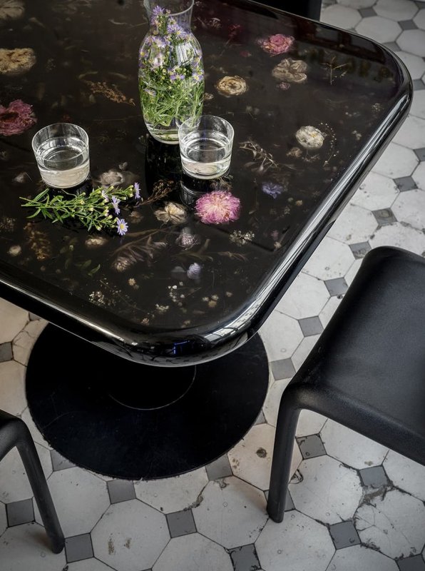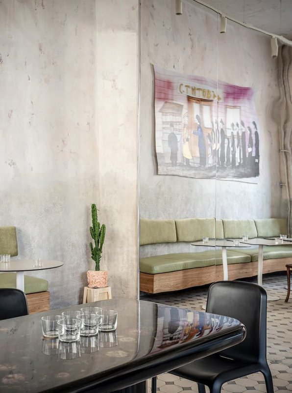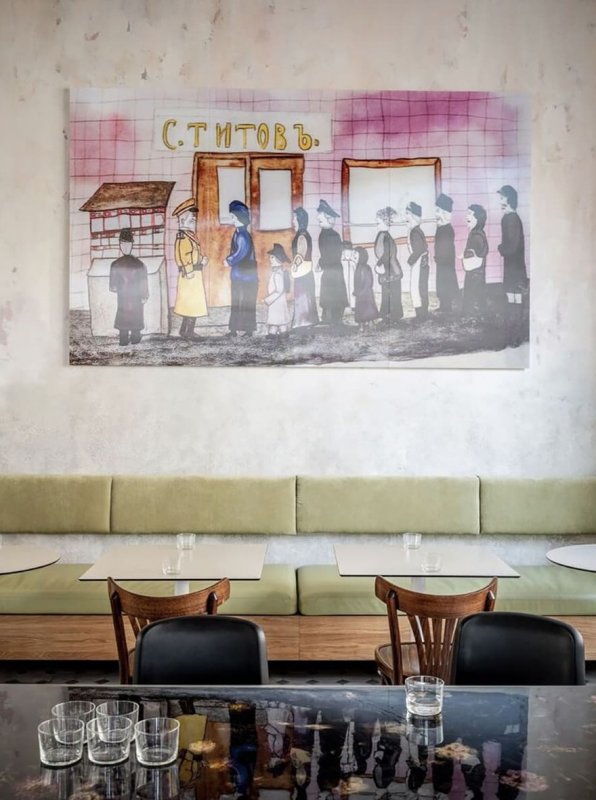 Момент, когда прошлое встречается с настоящим, передан через картину — рисунок неизвестного автора «Очередь в булочную Титова», найденный в архивах, был оживлен с помощью эффекта стерео-варио и в таком виде украсил одну из банкеток кафе. Несмотря на референсы к прошлому здания, интерьер выглядит вне времени: обилие естественного света и простор делают пространство уютным и гостеприимным. О том, что вы пришли именно в кулинарию Grechka LAB, красноречиво говорит стол из эпоксидной смолы: в его глянцевой поверхности застыли полевые сухоцветы, в том числе, соцветия гречки.