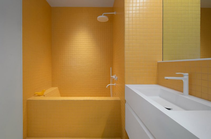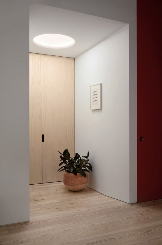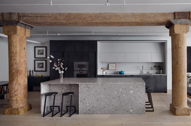 Общественные зоны — гостиная и кухня — организованы как открытое пространство без перегородок и стен, главной задачей архитекторов было пустить солнечный свет как можно глубже. Центром композиции стал мраморный кухонный остров, который почти бесшовно сливается с деревянным полом и позволяет барным стульям наполовину «спрятаться» в нишах. Особенное внимание в проекте отдано отделкам — стены частично отделаны рельефной штукатуркой, кухня и шкафы для хранения — тонированным ясенем, а на полу лежит восстановленная сосновая доска.
