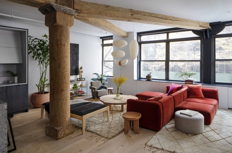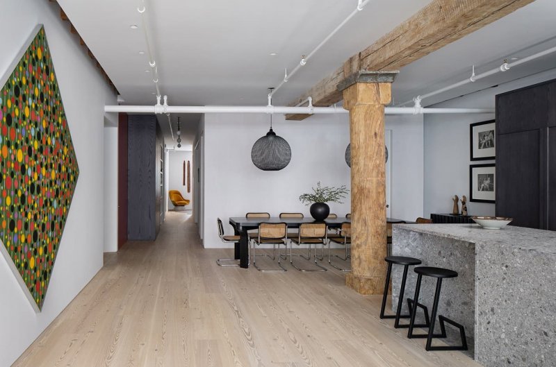 Нью-йоркская студия Worrel Yeung обновила интерьер в бывшей студии художника, занимающей половину этажа в здании 20 века в Челси. Дизайнеры отреставрировали исторические деревянные колонны и потолочные балки, и сняли с них зеленую краску; стены и потолок покрасили в белый, оставляя главную роль в интерьере дизайнерским объектам и произведениям искусства.