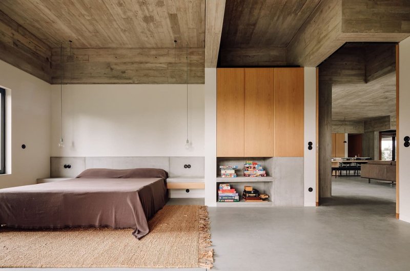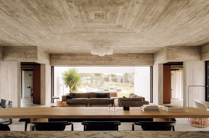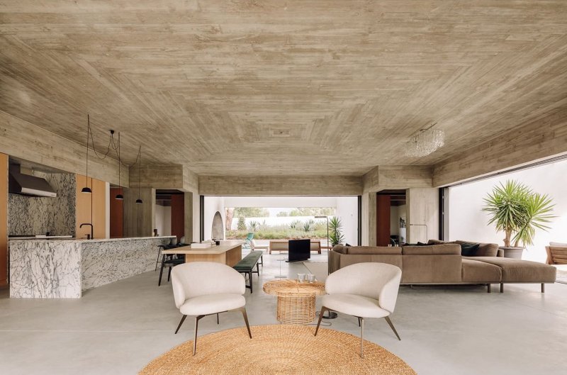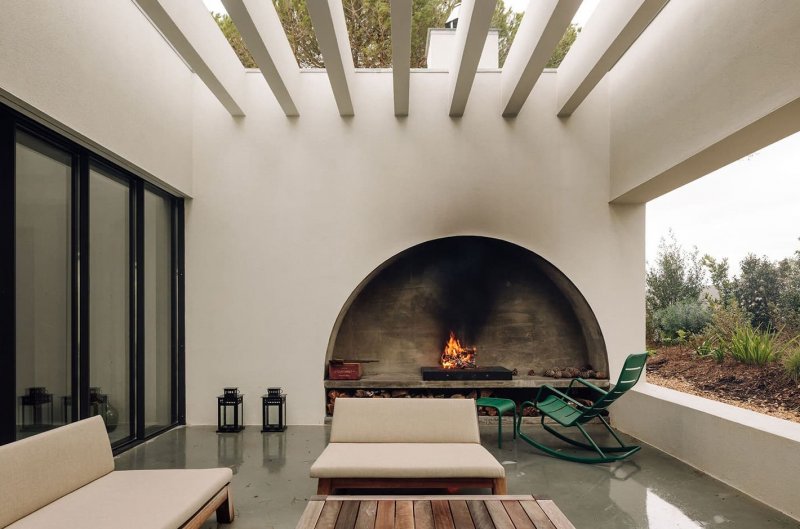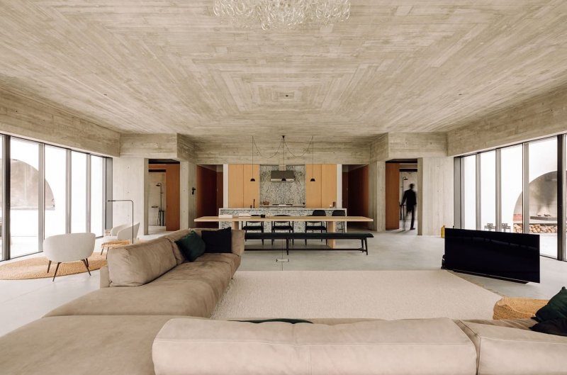 Гостиная с бетонным полом и потолком имеет остекление на три стороны – каждая из панелей открывается и дает возможность почти полностью объединить индор и аутдор. Одна из террас выходит на 15-метровый бассейн, полностью экипированный для обедов и ужинов на открытом воздухе. Еще одна оборудована огромной арочной нишей, где расположился открытый камин.