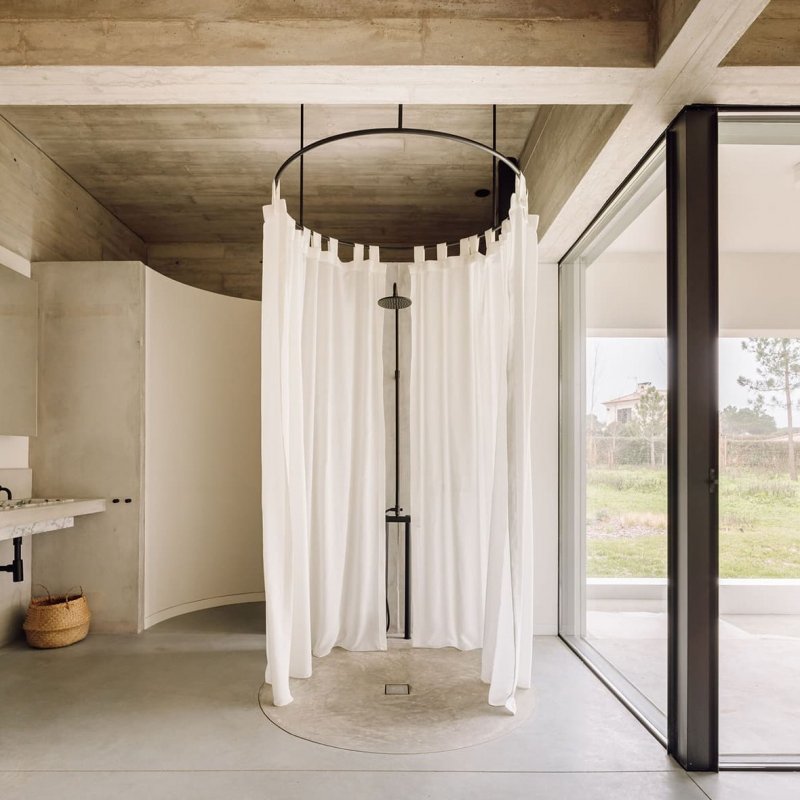 Главное пожелание – максимально открытая планировка для общественных пространств и наличие обособленных зон для каждого гостя. Поэтому Atelier RUA спроектировали «идеальный квадрат»: в центре проекта большая открытая гостиная, а по углам – гостевые люксы (тоже квадратные), каждый из которых имеет отдельную ванную, гардеробную и собственный внутренний дворик. Для изготовления ванны и раковины в ванной комнате использован мрамор, кроме того, в каждой комнате есть открытая душевая, экранированная белой занавеской, которая свисает с круговой дорожки на потолке.