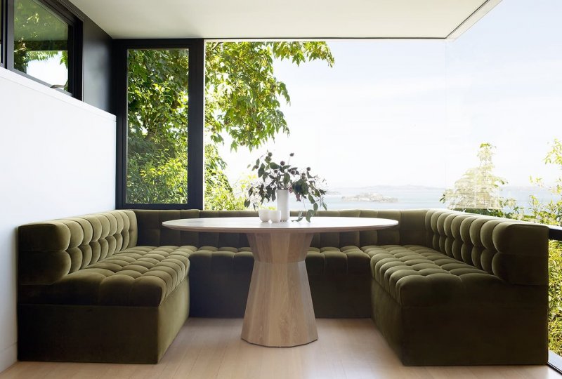 Дом расположен в районе Russian Hill. JDP Interiors выполнили перепланировку интерьера для молодой пары. Основным пожеланием заказчиков было пространство светлое, свежее, «молодое» по духу — и по подборке предметов. Шезлонг BDDW задал тон всему проекту. В выборе цветов дизайнеры опирались на окружающую природу, так как дом с таким акцентным обзором фактически является ее частью. Белые стены и полы из светлого дерева служат фоном для мебели — зеленого, коричневого и кремовых оттенков. Очень простым, но красивым акцентом стала лаунж зона с u-образным диваном, выполненным на заказ, вокруг стола Stahl+Band.