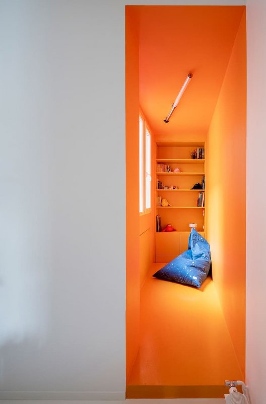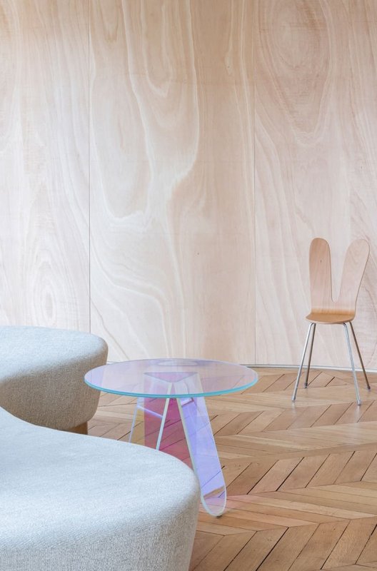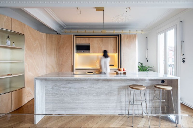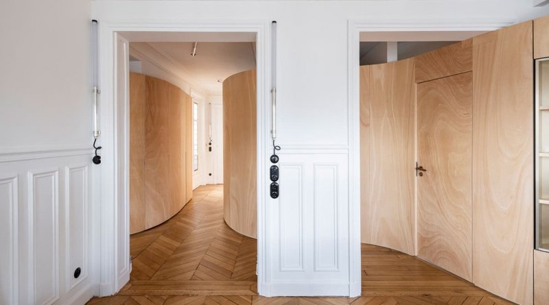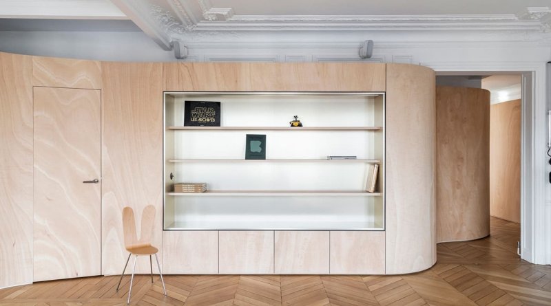 Toledano+Architects поставили себе амбициозную задачу наделить новым архитектурным смыслом типичное пространство исторической парижской квартиры — с лепниной, паркетом елочкой и длинным балконом. Архитекторы нашли очень необычное решение и пустили инсталляцию из вьющейся фанерной стены сквозь всю квартиру.