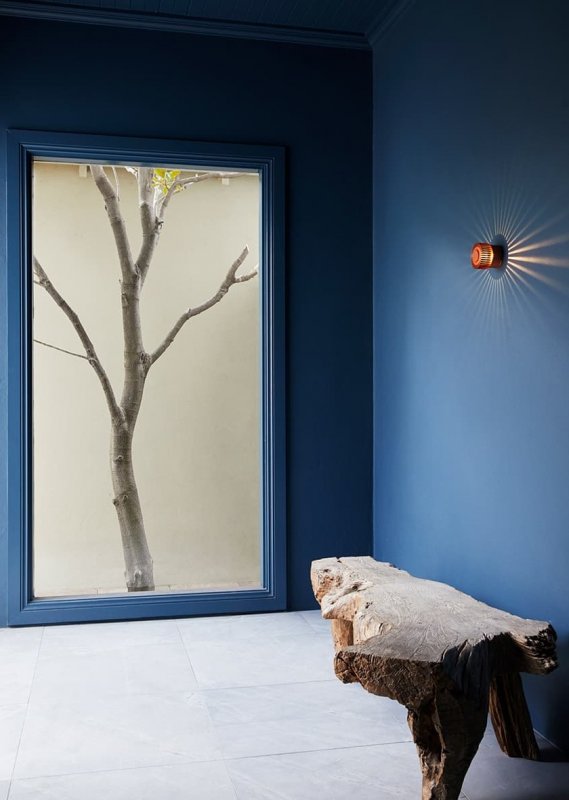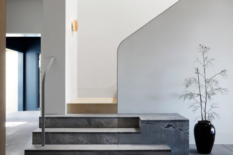 Трехэтажный дом складывался постепенно: первый ярус был построен в 1920-х годах; подвал и второй этаж появились в 1990-х годах. Несмотря на то, что дом был большим, безликие, плохо сочетающиеся между собой комнаты, давали ощущение разрозненного нелогичного пространства. Студии Esoteriko разрешили полностью все поменять — изменить планировку, подобрать новую палитру и материалы. Основными выразительными средствами в интерьере стали локальные материалы (местный песчаник и мрамор, южно-австралийская черная древесина), верность японской чистоте и минимализму. Клиент и его семья родом из Азии, и это их первая австралийская резиденция — поэтому дизайнерам важно было подчеркнуть принадлежность дома к окружающему ландшафту, как часть ассимиляции. Элементы синего цвета, встречающиеся в интерьере как акцент, добавляют прохладу и позволяют почувствовать облегчение от теплого дерева и натурального камня, которые активно используются в разных комнатах. Именно этот сложный цвет, глубокого и капризного прилегающего океана, дочка владельца выбрала основным для своей спальни. Монохромная и загадочная комната не только послужила ярким акцентом в проекте, но и дала ему название — Balmore Blue House.