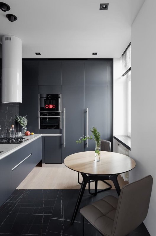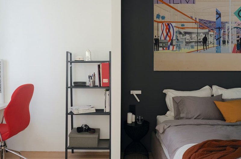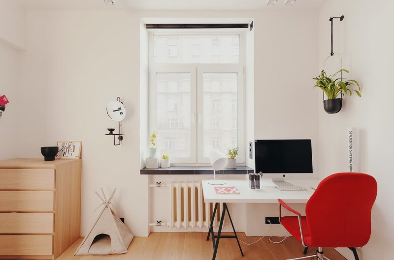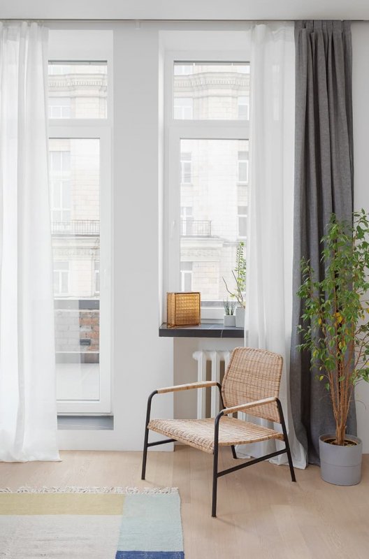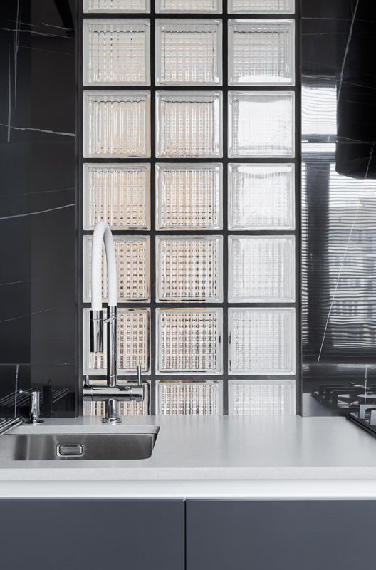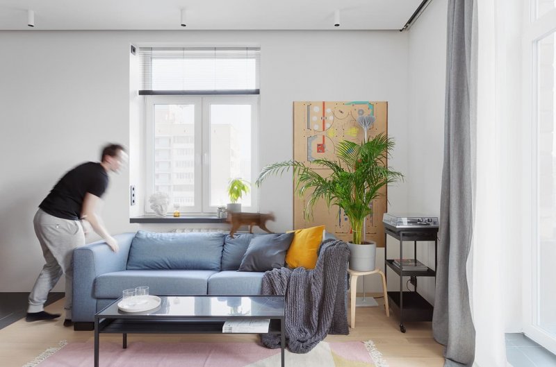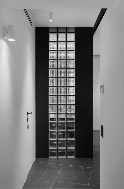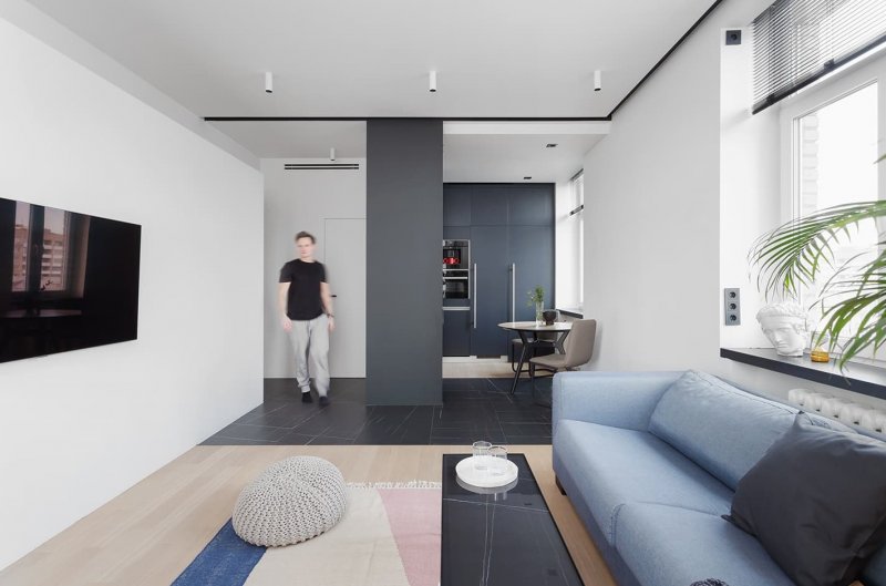 Квартира заказчиков расположена в сталинском доме, построенном по индивидуальному проекту архитектора Иосифа Ловейко. Из достоинств исходного проекта — большое количество окон, высокие потолки и угловая планировка. Планировку архитекторы доработали — теперь по квартире можно перемещаться по кругу. Кухня объединена с гостиной, но при желании в будущем ее можно отделить. В гостиной стена с телевизором выдвинута вперед — такое решение позволило спрятать провода и создать минималистичную геометрию: черный экран на белоснежной стене. В очень современном по духу проекте использованы отсылки к советской эпохе — стеклоблоки в прихожей (чтобы добавить дневной свет), работы советского художника Василия Рождественского, акценты цвета охра, проигрыватель для пластинок и другие аксессуары.