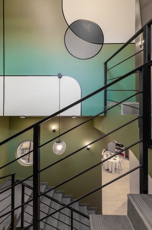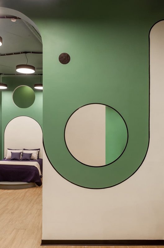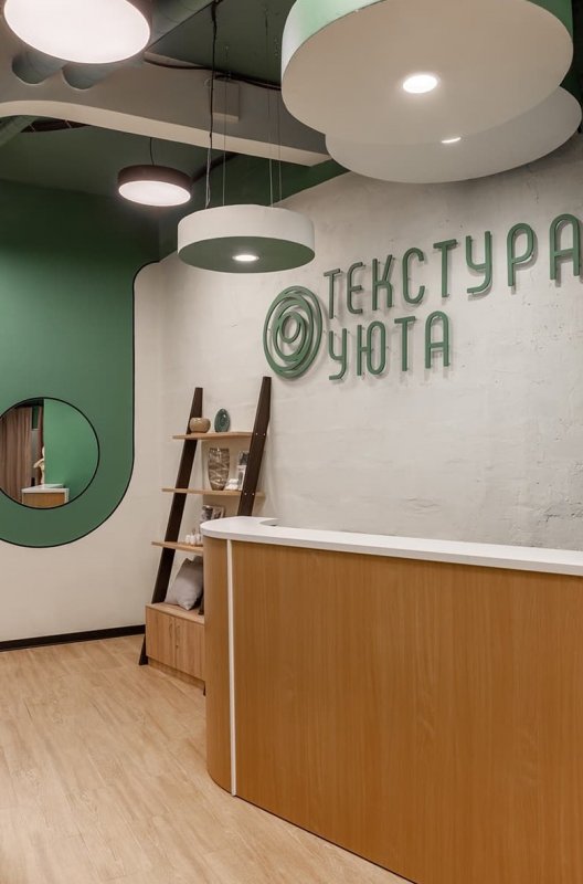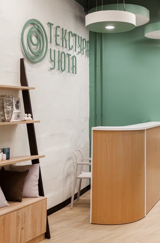 Главная особенность магазина «Текстура уюта» в подмосковье — его расположение: подвал многоквартирного дома. Здесь отсутствуют окна, но имеются очень высокие потолки. Чтобы попасть в зал, необходимо спуститься вниз по достаточно длинной лестнице. Оформление входной зоны — чтобы вдохновить потенциального клиента воспользоваться лестницей и войти — задало тон всему интерьеру. Фишкой проекта стала двухмерная графика, захватывающая внимание и создающая иллюзию трехмерного пространства. Графика переходит в объем, а архитектурные решения становятся частью общей картинки. Благодаря нежным оттенкам и плавным линиям архитекторам удалось сохранить ощущение уюта, важное для шоу-рума, который занимается продажей товаров для дома.