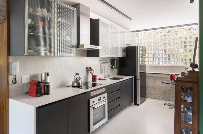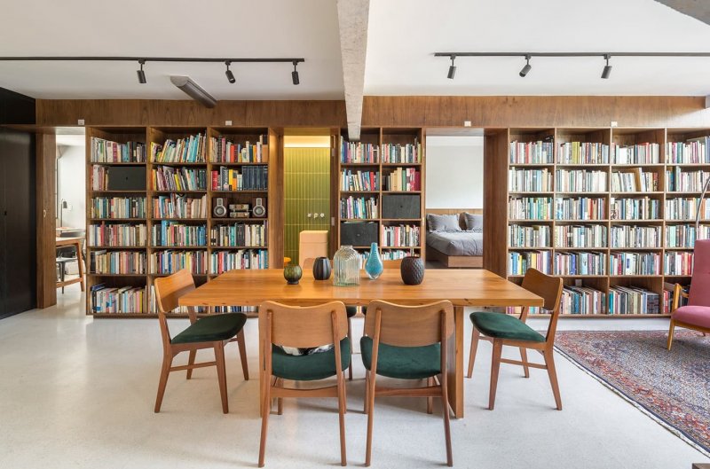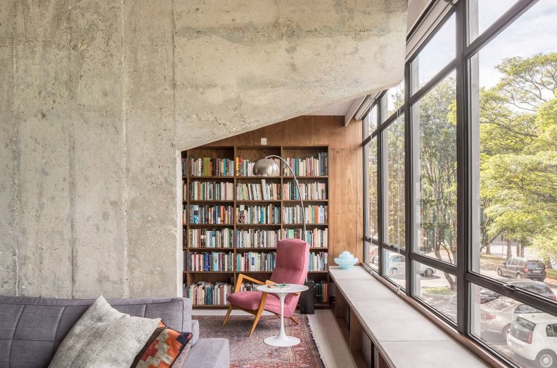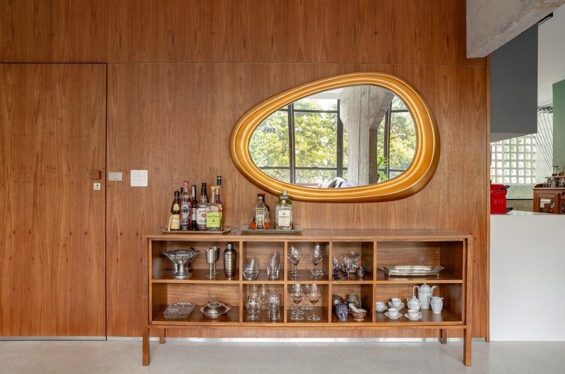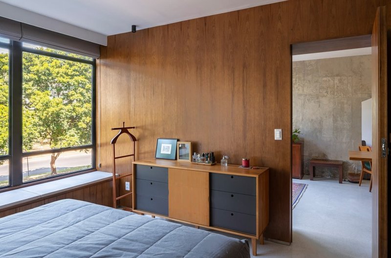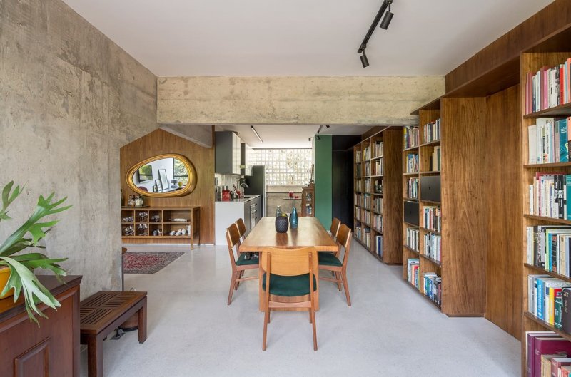 Квартира находится в жилом здании в суперквартале SQS 308, в одном из первых завершенных проектов градостроительной схемы, задуманной архитектором Лучио Коста и ландшафтным архитектором Бурле Марксом. Архитектура квартала бережно следует принципам модернизма, сам дом построен в 1960-х годах. Debaixo do Bloco Arquitetura изменили планировку пространства, поделив квартиру на две зоны: общественная объединила открытую кухню, столовую, гостиную и мини-библиотеку, а в частной — за большим книжным шкафом спрятались две спальни и два санузла. Архитекторы сохранили оригинальный гранитный пол и белые блоки кобого, а также — утрировали засилие бетона в интерьере. Оставив необработанную бетонную стену по центру общественного пространства, архитекторы наделили ее фигурными прорезями — сделав похожей на огромную скульптуру. Мебель, ковры и активная инкрустация дерева по периметру разных комнат компенсируют холодную брутальность модернизма и добавляют в атмосферу теплый дух midcentury.