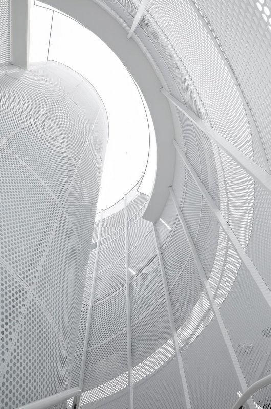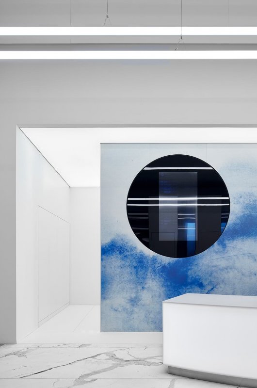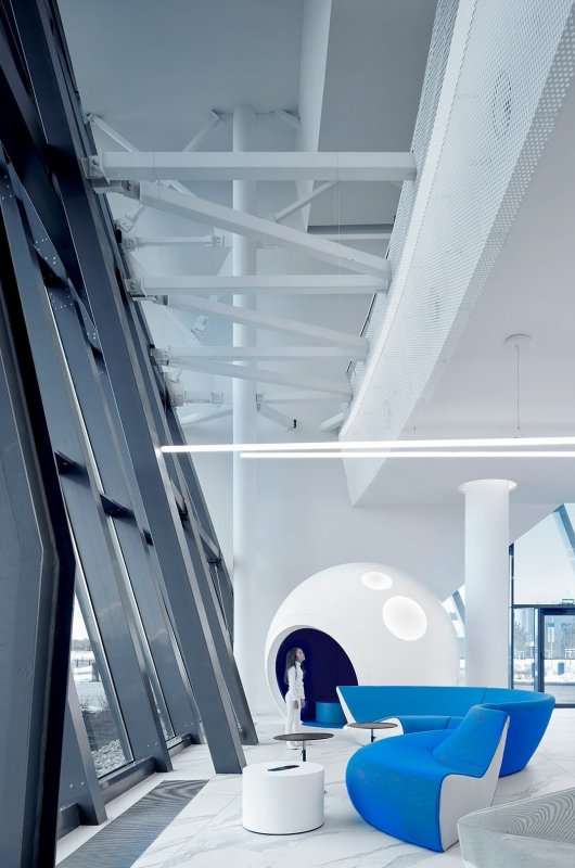 Отправной точкой для поиска дизайн-решения залов саратовского аэропорта стал космос. Вертикальный «столб света» — элемент организации двухуровневого интерьера, который включает в себя сложный архитектурный объем из круглой парящей лестницы, лифта, находящегося в ядре конструкции, примыкающем к нему бару и освещения, дематериализующего пространство. Колористическое решение строится на «небесном» сочетании белого цвета с разными оттенками синего. Бело-синие предметы похожи на облака, рассекаемые рвущейся в мезосферу ракетой.