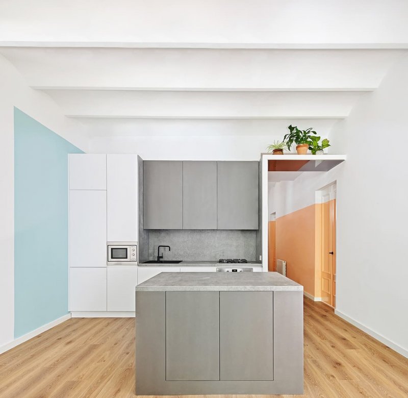 Апартаменты расположены в двухэтажном доме в городе Виладеканс и заняты семейной парой и двумя маленькими дочерьми. Раньше здесь жили бабушка и дедушка мужа, после их кончины, он решил переехать поближе к родителям, которые занимают верхний этаж, и превратить пространство в квартиру для своей семьи. Планировку архитекторы почти не тронули — несущая стена делит ее вдоль на две части. Эта стена стала стержнем квартиры, отделяющим спальные помещения от жилых комнат.
