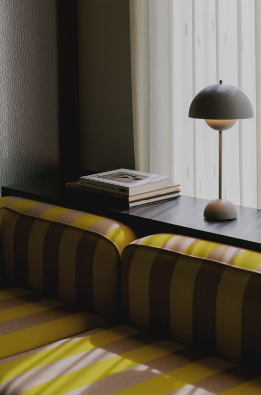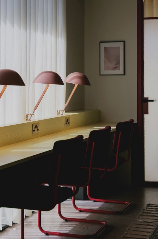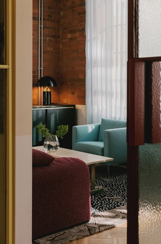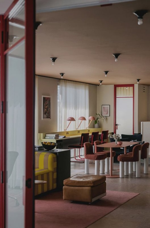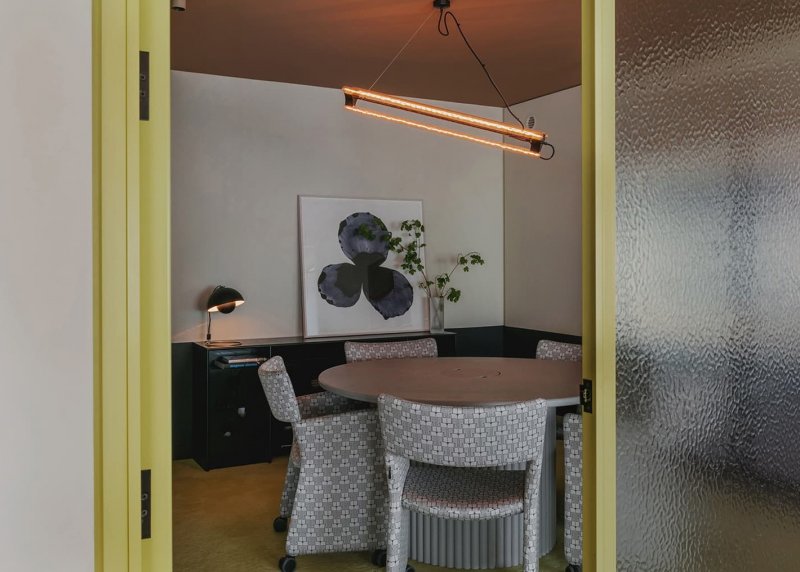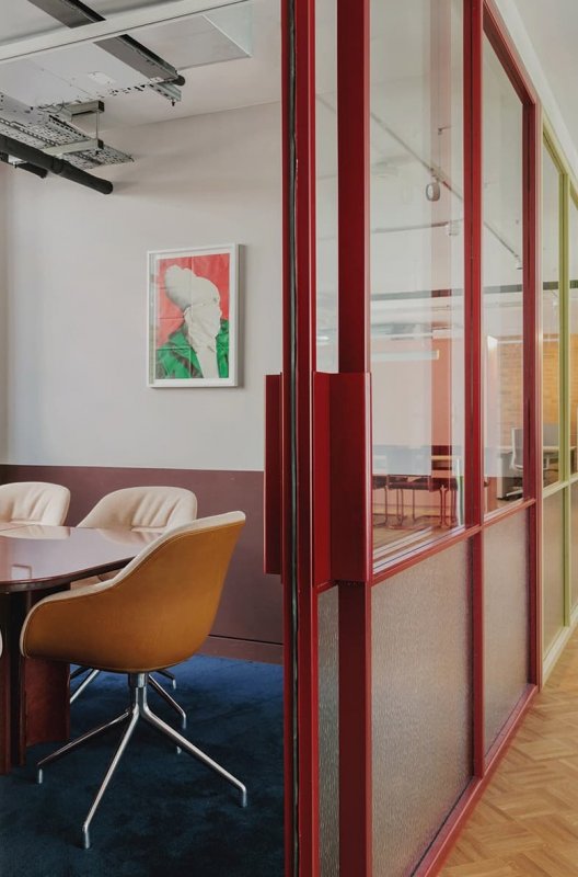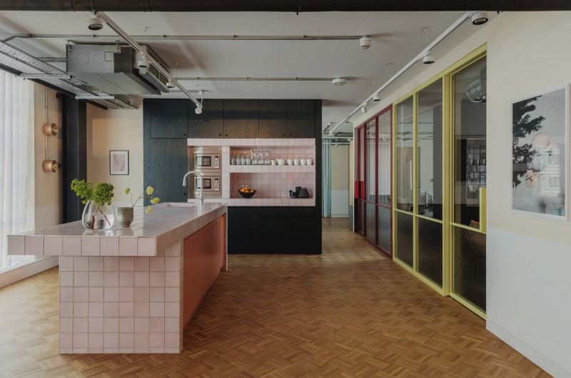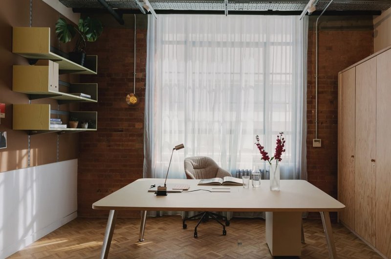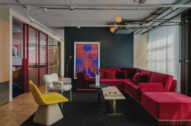 Офис медиакомпании в центре Лондона занимает три этажа бывшего склада, построенного в XVIII веке. Детали из индустриального прошлого (большие окна, кирпичную кладку) в интерьере сохранили, но внимание на них решили не акцентировать. Важным пожеланием заказчиков было создание «сильной феминной эстетики». Так, в референсах появились снимки Слима Ааронса (светский фотограф Америки 50-х годов), калифорнийский дизайн эпохи mid-century и теплая винтажная колористика с рекламных плакатов того времени. Офис получился настолько уютным и домашним, что в деталях напоминает, скорее, квартиру с большим количеством гостиных. В кабинетах и переговорных лежат толстые ковры, стулья, кресла и диваны имеют красивую текстильную обивку, по всему офису расставлено большое количество приставных столиков, настольных ламп, растений и картин.