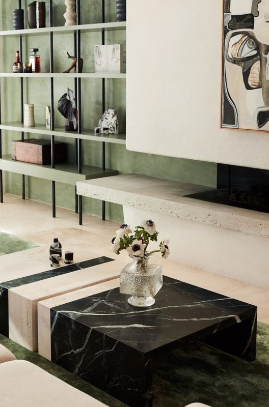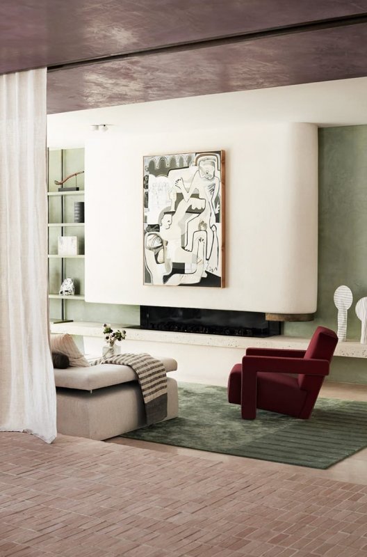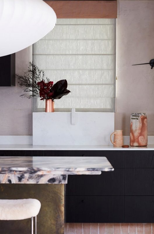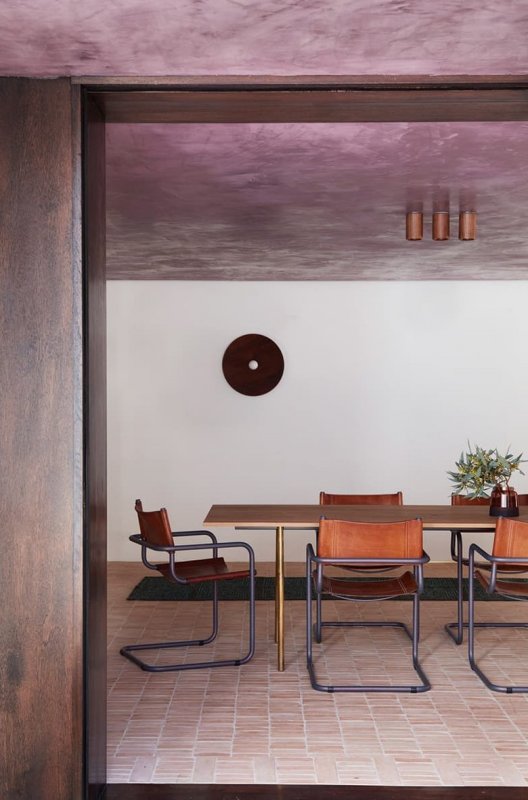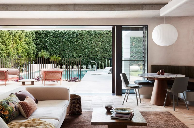 Первым делом YSG разрушили все возможные перегородки, чтобы сформировать открытое общественное пространство с гостиной, кухней и столовой. Основной задачей бюро было создание плавной, «текучей» атмосферы. Кроме того, важно было, чтобы пространство было ярким и полным природных контрастов, чтобы первый этаж стал продолжением внушительного сада за окном. Этой цели служит терракотовая плитка на полу, бесшовно интегрированная во всю нижнюю плоскость, как на террасе, так и внутри дома на первом этаже. Дискретным фоном для скульптурной мебели и харизматичного декора стала штукатурка Marmorino — дизайнеры осознанно ушли от стандартного белого в пользу насыщенных, тактильных, но нюдовых оттенков: баклажанового, цвета ириса и мягкого зеленого. Интерьер был отмечен Australian Interior Design Awards 2020, как один из лучших в категориях «Дизайн частного пространства» и «Декор частного пространства».