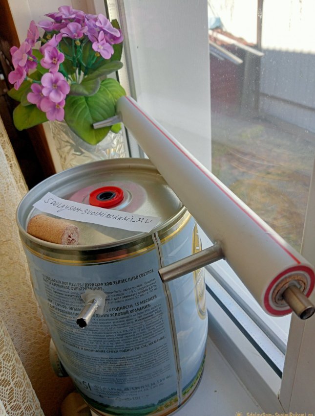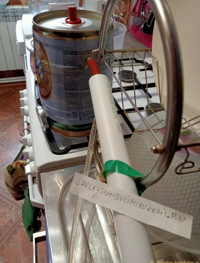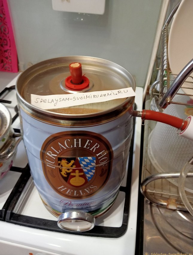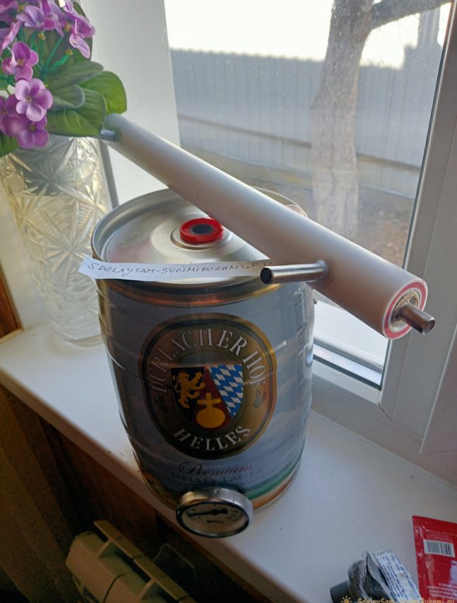 Дистиллированная вода нужна была в объеме 3-х литров: для серебрения и для восстановления свинцового аккумулятора. Тогда я вспомнил, как получал чистый спирт из водки, с помощью перегонки. Да ещё и вот подарок мне подарили на днях – большой бочонок пива. 5-и литровая жестяная банка с краником. Так что решено было сделать простой перегонный аппарат из имеющихся деталей.