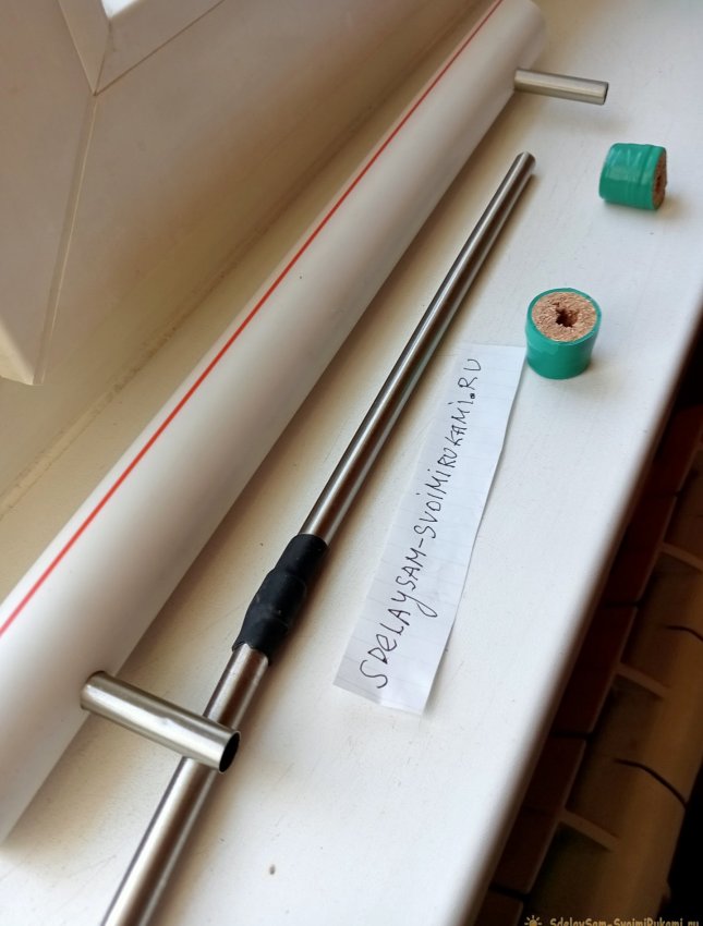 Следующим этапом нам понадобятся две одинаковые торцевые прокладки. для этих целей подходит винная пробка плотно входящая во внешнюю трубу. Пробку нужно просверлить вдоль по центру, чуть меньшим диаметром внутренней трубки. Далее пробка разрезается поперек пополам канцелярским ножом.