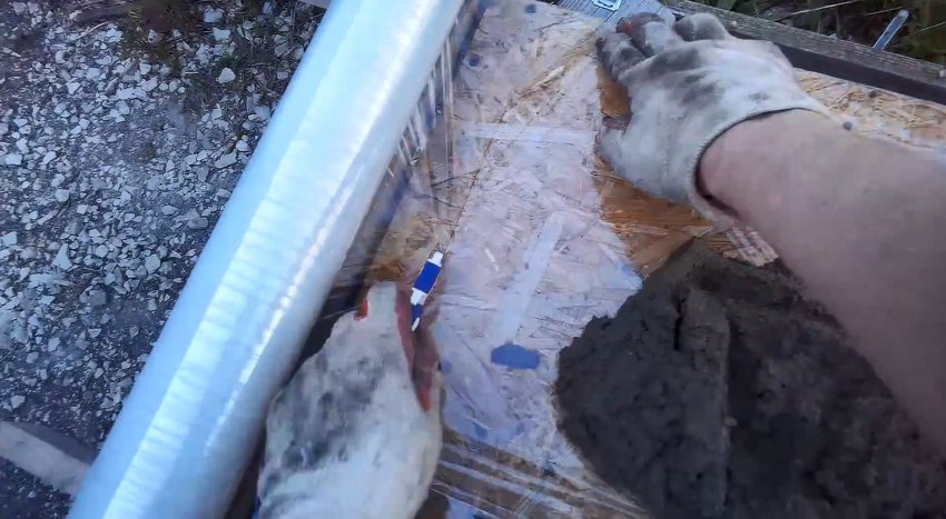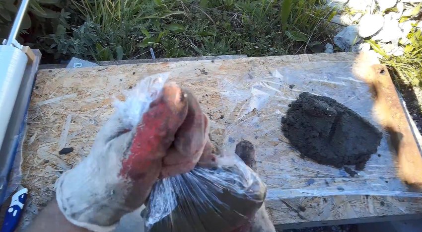 Тщательно вымешиваем смесь песка и цемента. Расстилаем пищевую плёнку на ровной поверхности и начинаем выкладывать на неё готовый раствор. Количество зависит от желаемой величины камня. На булыжник для мощения дорожек выкладываем почти два мастерка цементного раствора. Отрезав необходимый по размеру кусок плёнки, заворачиваем в него бетон. Будущий камень почти готов.