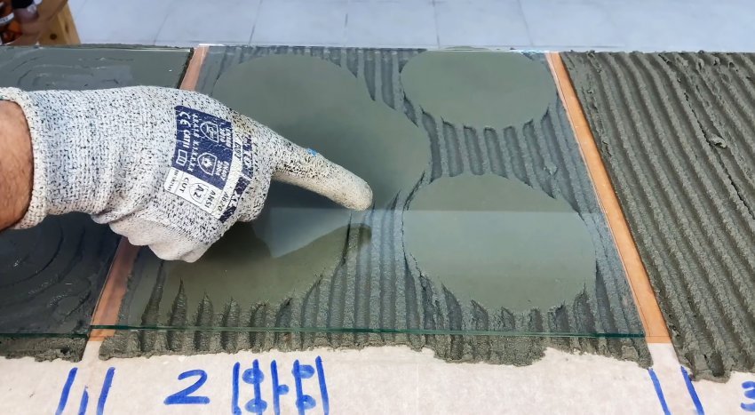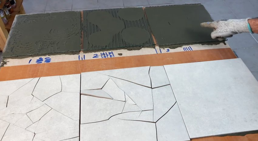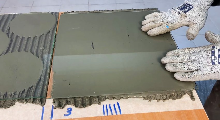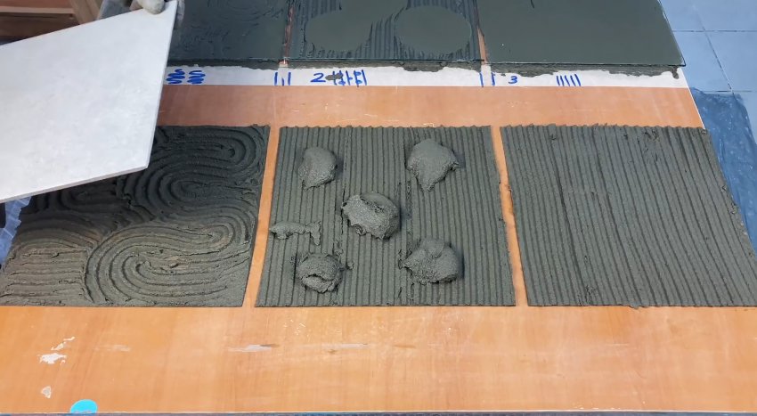 Для подтверждения качества третьего варианта можно повторить нанесение клея, но использовать уже не стеклянные плитки, а керамические. Заполнить нужно три части стенда, имитируя кладку напольной плитки. При этом нужно повторить рисунок распределения клея, согласно первому испытанию.